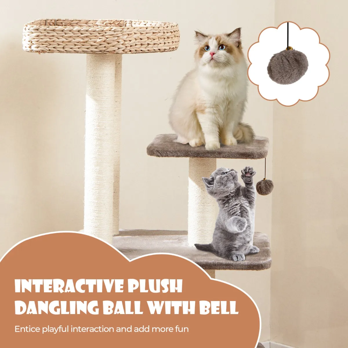 Onze houten kattenboom is ontworpen met 4 niveaus en biedt ruime activiteitengebieden met meerdere comfortabele rustplekken, waaronder een gezellige zitplaats bovenaan en een privéappartement. De zachte, gevoerde kussens zorgen voor ultiem comfort. De zitstok en de mand zijn gemaakt van handgeweven natuurlijk lisdoddemateriaal, dat comfortabel, ademend en koel is. Het bevat verschillende natuurlijke krabpalen van sisal, zodat ze hun klauwen kunnen scherpen, en een interactieve hangende bal met een belletje voor speels contact.