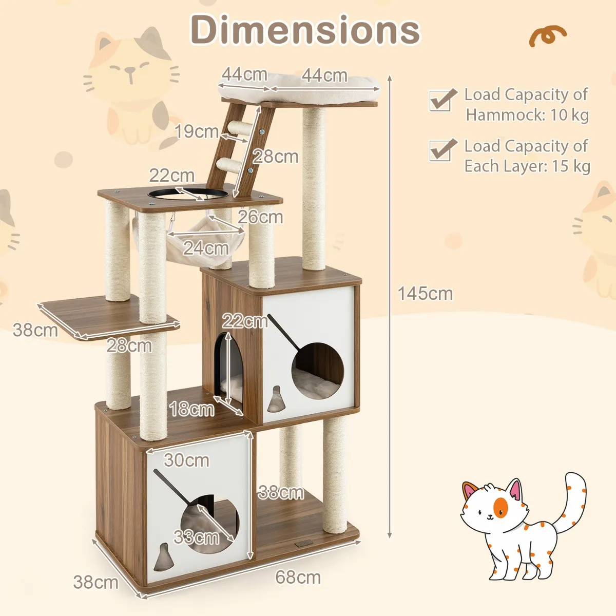 Verras uw katten met een veelzijdige krabpaal gemaakt van diervriendelijke materialen en die superieur comfort biedt. Dit kattenactiviteitencentrum beschikt over meerdere uitkijkplatforms, een ladder en een hangende hangmat voor eindeloos speelplezier. Ook in de 2 kattenverblijven en op de bovenzitplaats kunnen uw katten genieten van comfortabele rustplekken. Praktisch gezien zijn de bovenste zitplaats en de zachte matten van de appartementen gemakkelijk afneembaar en wasbaar. Volledig omhulde sisalpalen bevredigen het klauwinstinct en beschermen uw meubels. De stevige constructie met verdikte planken en afgeronde hoeken garandeert stabiliteit en veiligheid, aangevuld met antislipvoetkussens. Geef je harige vrienden een veilige en leuke plek met deze alles-in-één kattenboom.