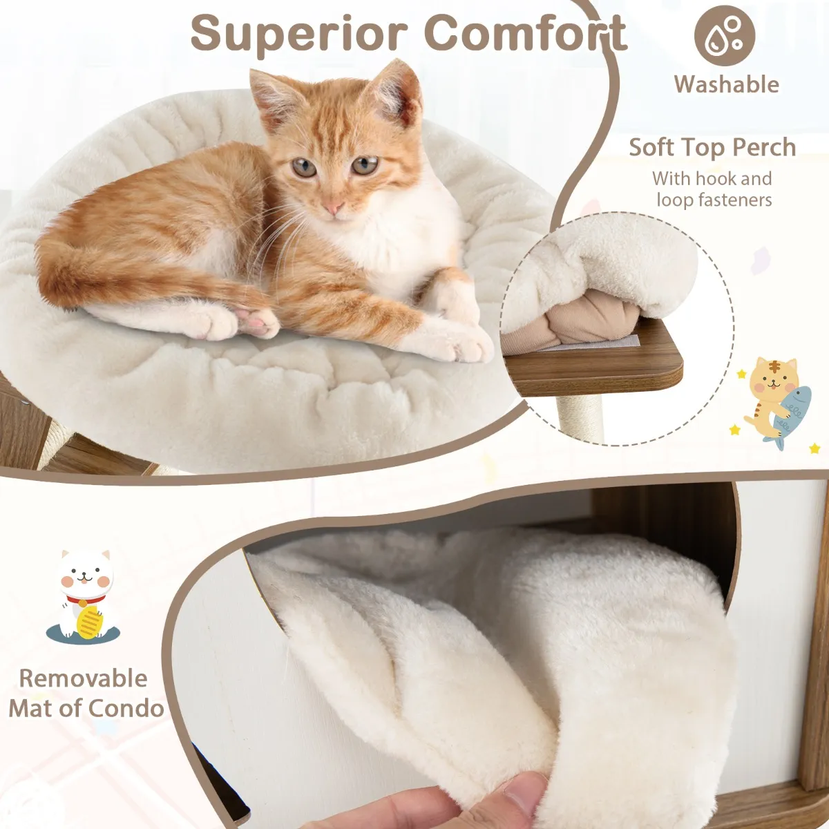Krabparadijs : De kattentoren bevat volledig omwikkelde sisalpalen, zodat katten hun natuurlijke krabinstincten kunnen bevredigen en hun klauwen gezond kunnen houden. Tegelijkertijd beschermt de rustgevende krabroutine indirect je huisraad.