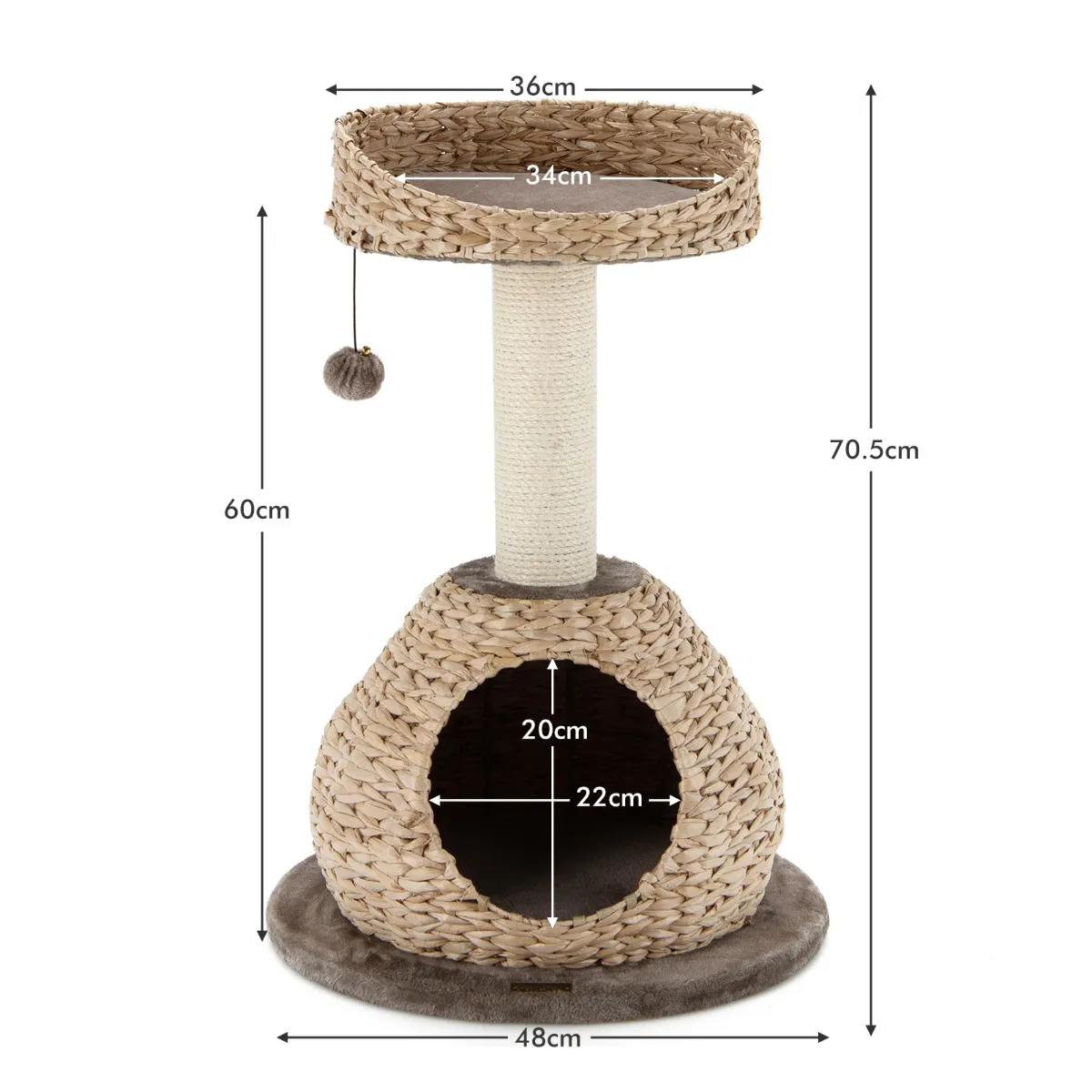 【Geselecteerde materialen & Handwerk】: De steunpaal is omwikkeld met 100% natuurlijke sisaltouwen. De dikke brede basis is gemaakt van eersteklas hout, sterk en stabiel. Bovendien zijn het mandje en het hokje met de hand gemaakt van natuurlijke waterhyacint rietjes, en de huidvriendelijke flanellen bekleding zorgt voor katvriendelijke zachtheid en warmte.