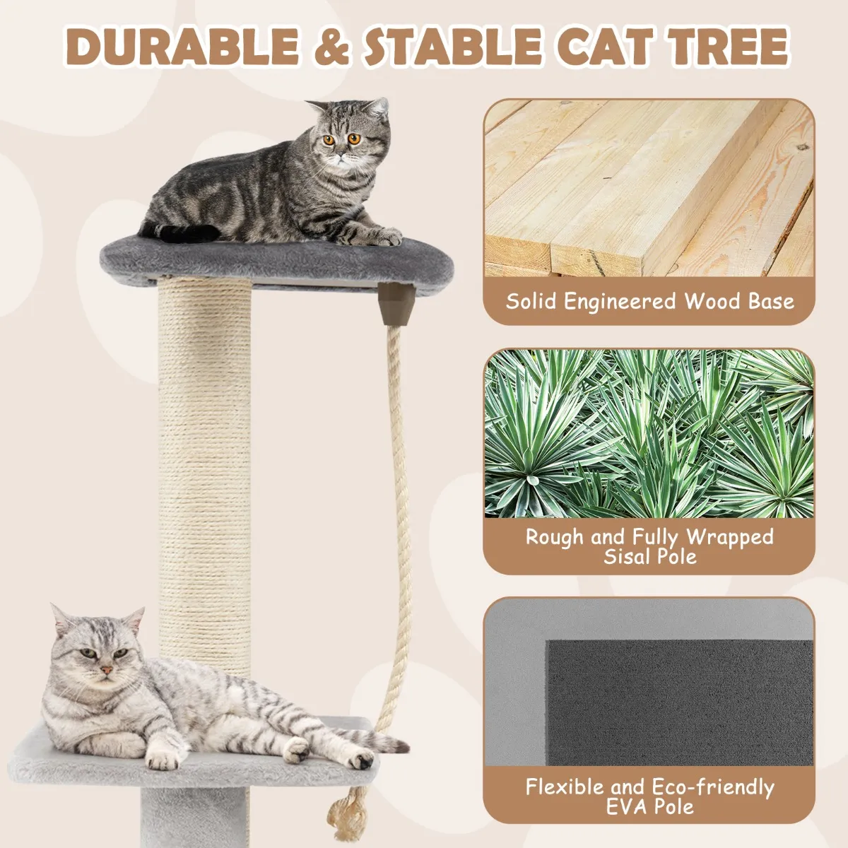 Onze krabpaal heeft een pluche zitstok, een springplatform, een hangende bal en een condo met een bamboemat zodat ze comfortabel kunnen rusten, springen en spelen. Hij heeft duurzame sisalpalen en een EVA borstel om hun nieuwsgierigheid te bevredigen, zodat ze zichzelf kunnen verzorgen en hun klauwen kunnen scherpen, om ze af te leiden van uw meubels. Hij heeft een stabiele structuur met een vierkante basis van gefabriceerd hout om een hoge draagkracht te garanderen, en het moderne, beknopte ontwerp maakt hem tot een veelzijdige binnenhuisarchitect.