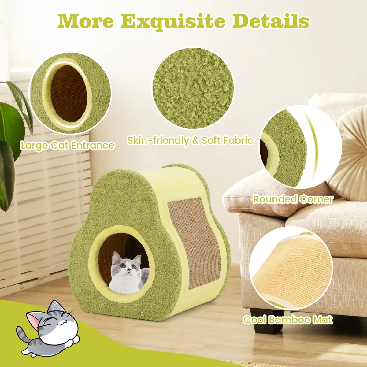【Avocado-vormig】: Deze kattenbeschutting is ontworpen met een innovatieve, avocado-vormige bovenkant. Hier kunnen katten gemakkelijk op klimmen en blijven zitten. Het biedt uw kat een uitkijkpunt waar hij kan ontspannen en de omgeving kan observeren, wat zijn gevoel van veiligheid en comfort vergroot.