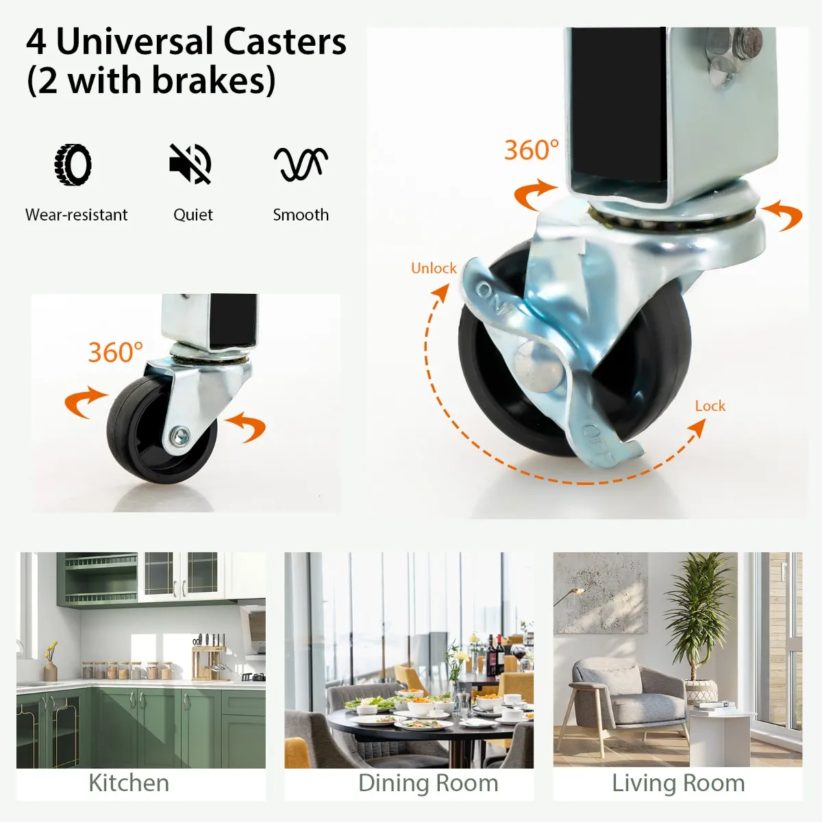 Super eenvoudig te verplaatsen en te vergrendelen: Deze keukeneilandkar is uitgerust met 4 soepel rollende universele wielen voor gemakkelijke mobiliteit. Onze verbeterde wielen zijn gemaakt van PU en metaal en werken beter dan gewone plastic wielen. Bovendien zijn twee van de wielen uitgerust met remmen, zodat u de rem kunt bedienen om ze te blokkeren en de kar stil te houden.