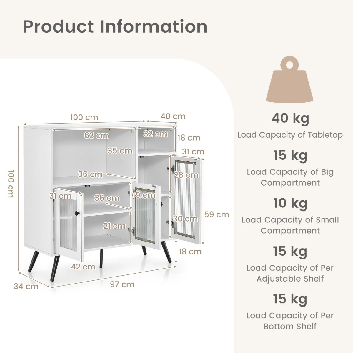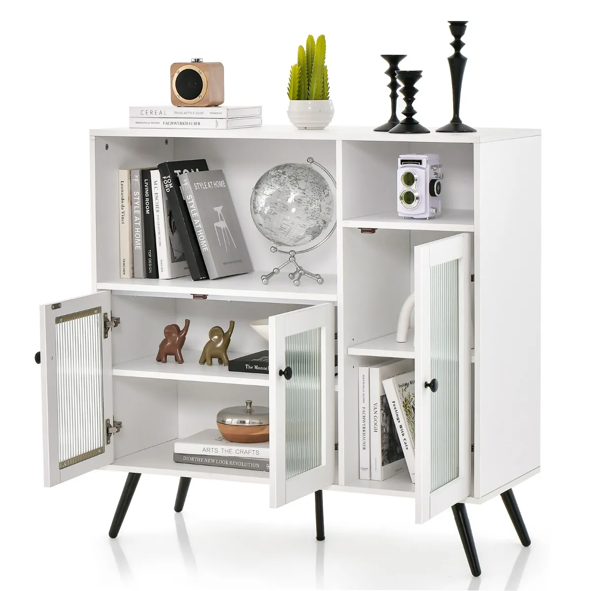 Hij bestaat uit hoogwaardig MDF en gecoat staal, waardoor het een hoge draagkracht heeft. Bovendien garandeert de kantelbeveiliging de totale stabiliteit. Dankzij de vier antislip onderzetters veroorzaakt de kast van 100 x 39,5 x 100 cm geen krassen op de vloer en staat hij zeer stabiel. Bovendien biedt hij je met zijn onderverdeelde opbergruimte en de verstelbare planken veel ruimte voor keuken, eetkamer en woonkamer. De deuren van gehard glas hebben magnetische scharnieren en handgrepen van zinklegeringen, die eenvoudig openen dienen en zeer veilig zijn.