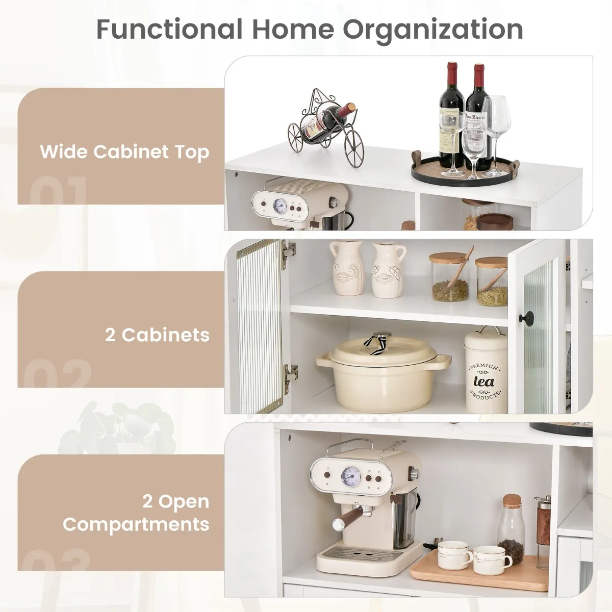 Ruime opbergruimte: De bijzetkast heeft met zijn grote bovenkant, de open vakken en de binnenkant van de kast een meervoudig verdeelde opbergruimte, die voor verschillende behoeften kan worden gebruikt. De planken zijn drievoudig verstelbaar (3,8 cm per trede) en maken een flexibele aanpassing mogelijk.