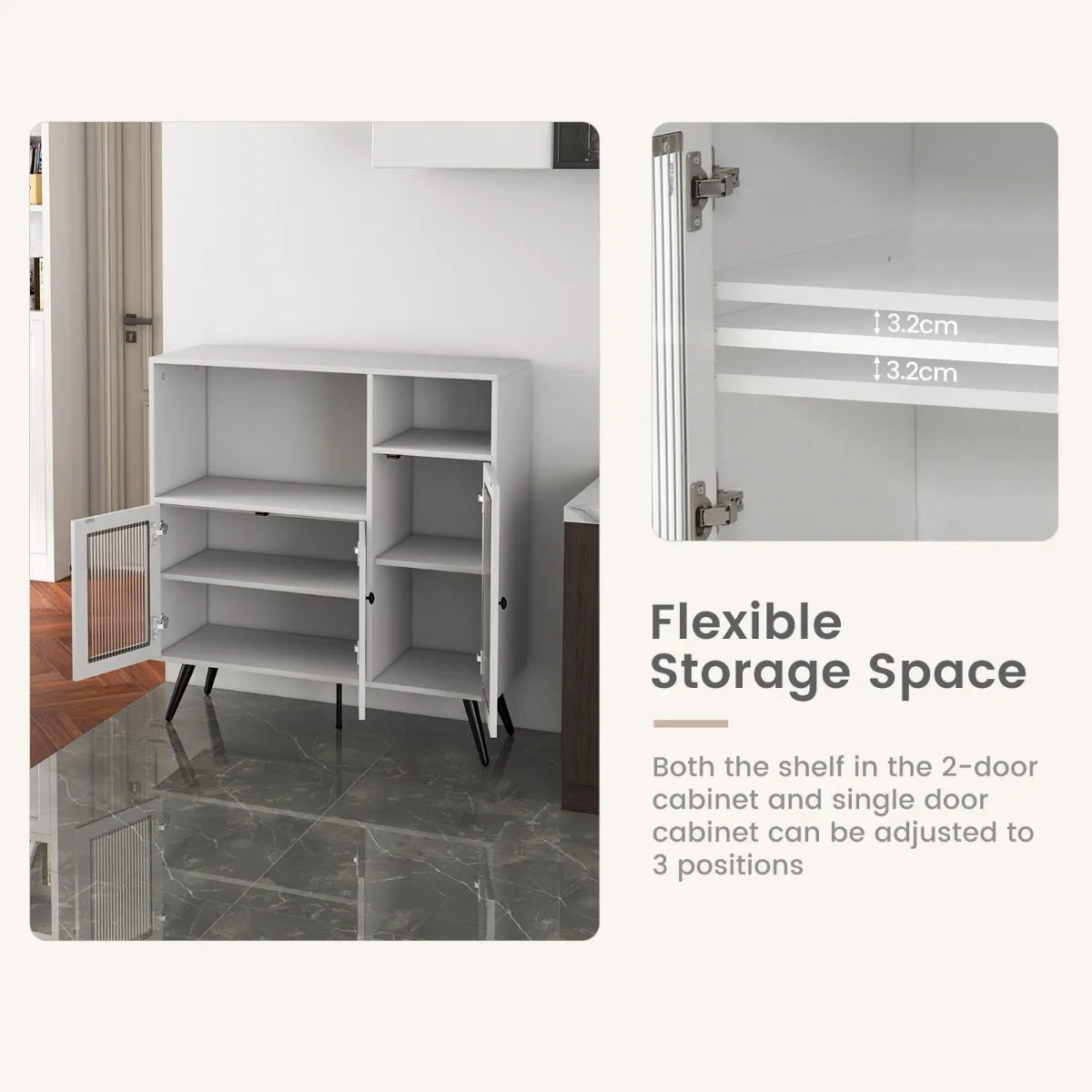 Stabiele en veilige structuur: Met de kantelbeveiliging kan de kast veilig aan de muur worden bevestigd, waardoor omvallen wordt voorkomen. De antislip onderzetters op de poten voorkomen krassen op de vloer en het middelste been verhoogt de stabiliteit.