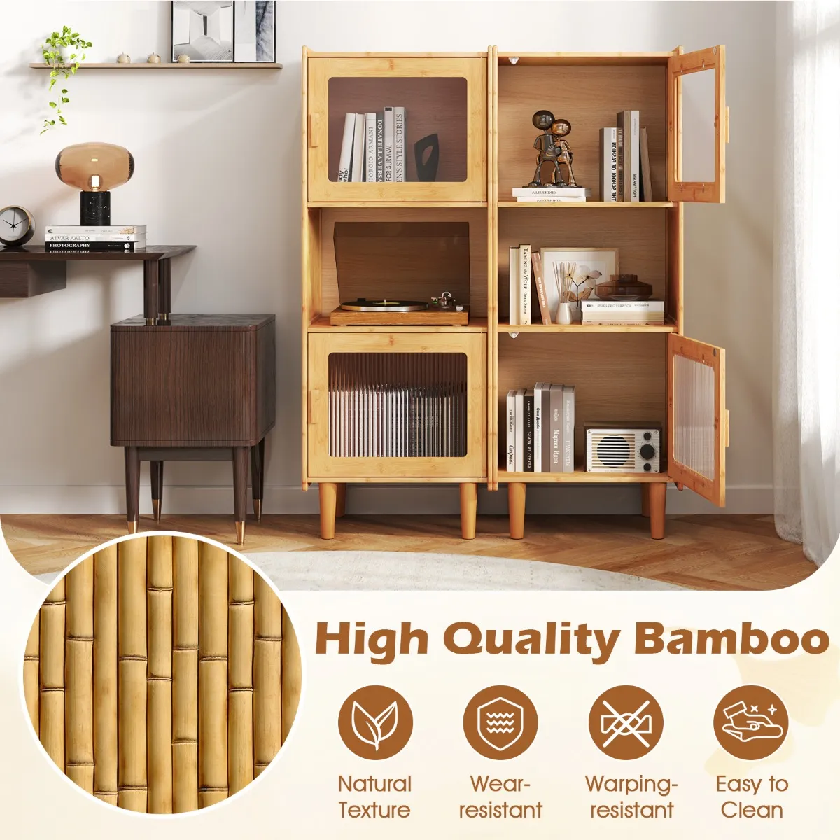 Met een combinatie van open en doorzichtige vakken biedt onze kast comfortabele toegang tot je belangrijke spullen, terwijl deze tegelijkertijd zichtbaar blijven. De transparante en gestructureerde acryldeuren zorgen voor een moderne flair die elke interieurstijl aanvult, terwijl de robuuste bamboeconstructie, de magnetische deursluitingen en de beschermende verhoogde randen je spullen veilig op de planken houden. Bovendien is hij uitgerust met een kantelbeveiligingsset en 4 antislip voetkussens voor een stabiele stand en gemoedsrust.