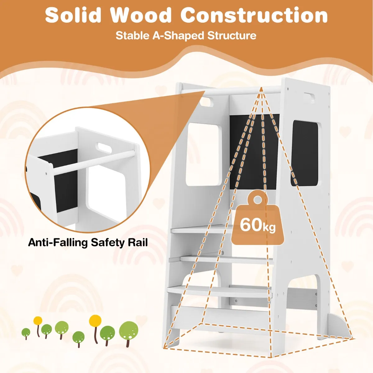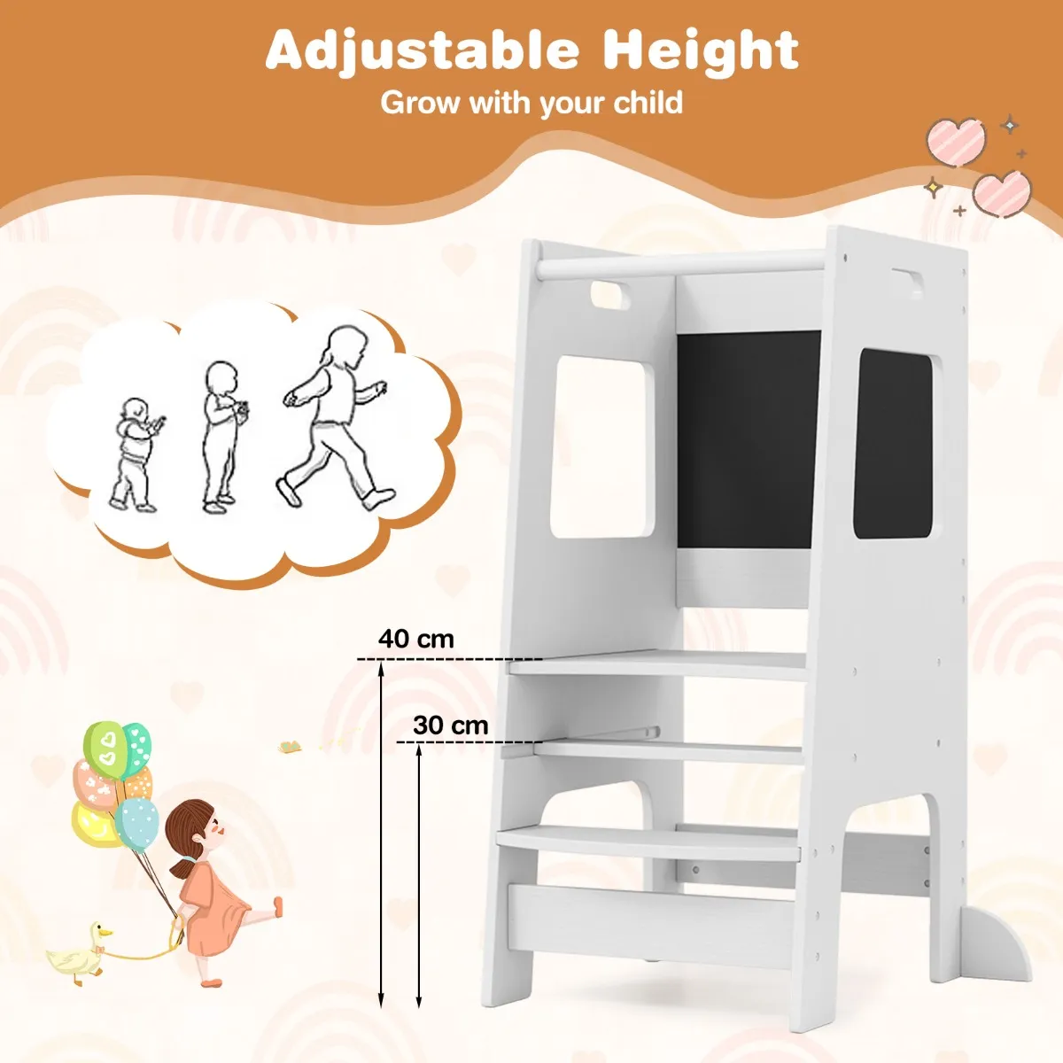 Dit opstapje voor peuters heeft een verstelbaar platform met 2 niveaus zodat je peuter veilig bij de toonbanken en gootstenen kan en zich comfortabel kan bezighouden met allerlei activiteiten. Geïntegreerde krijtborden stimuleren artistieke expressie en educatieve activiteiten. Het is gemaakt van massief hout en voorzien van veiligheidsfuncties zoals een anti-valrail en afgeronde hoeken. Het is geschikt voor kinderen vanaf 3 jaar en kan tot 60 kg dragen. Het dient ook als activiteitencentrum en stimuleert zelfstandigheid en leren in verschillende omgevingen.