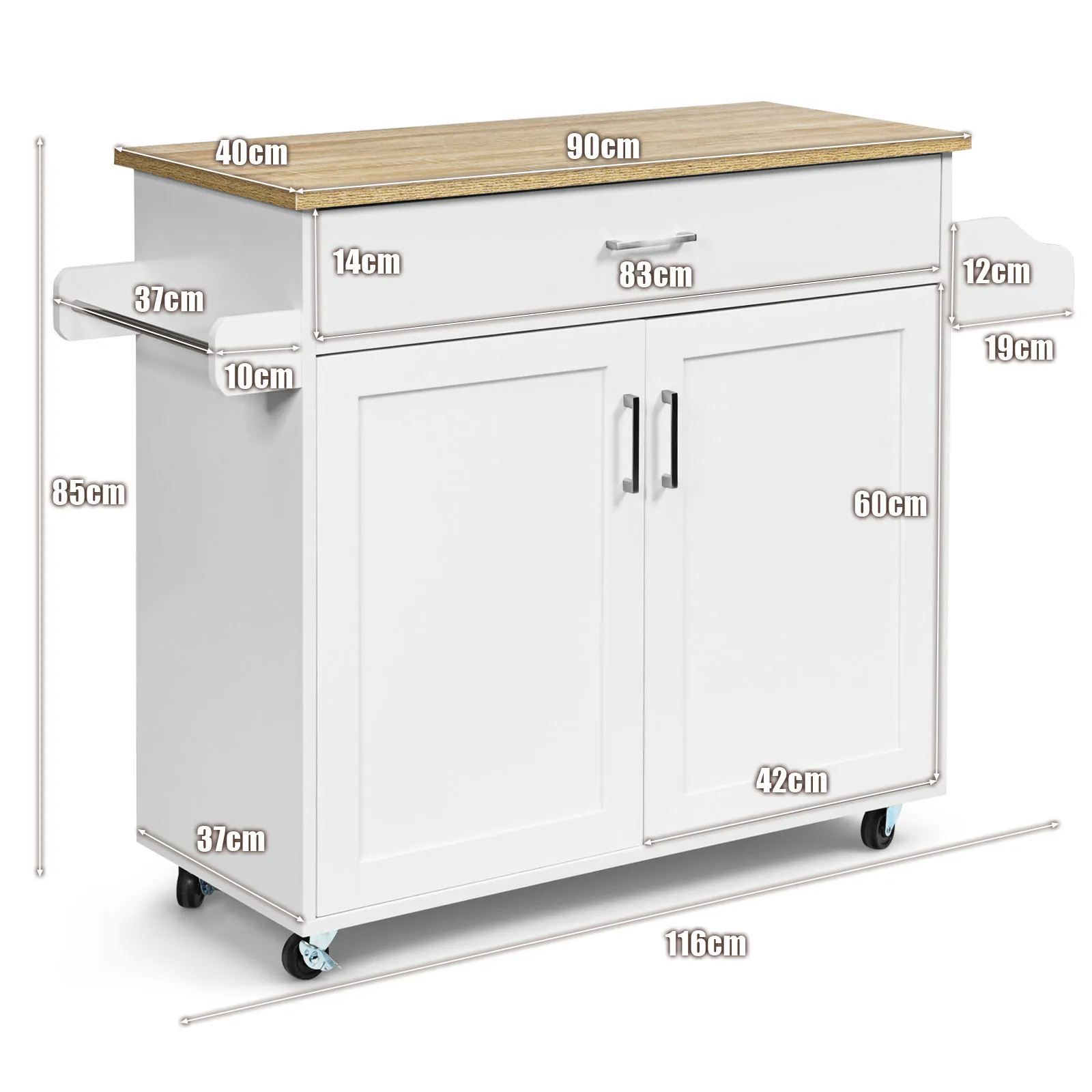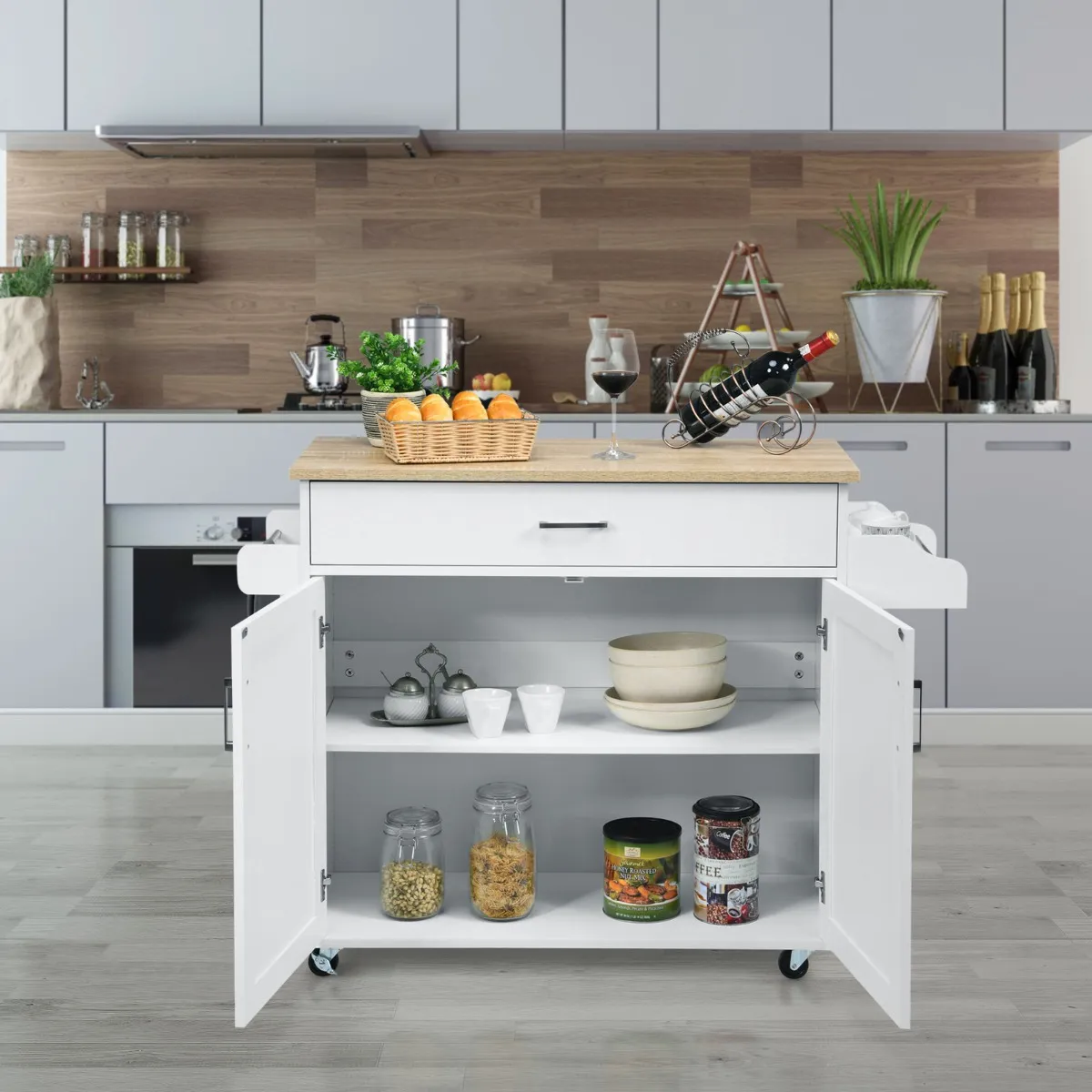 Perfecte opslagoplossing: Een grote lade en een ruime kast kunnen diverse gebruiksvoorwerpen, zilverwerk en glaswerk in een afgesloten ruimte bewaren voor een goede veiligheid. Daarnaast is de goed georganiseerde keukenwagen ontworpen met een handdoekenrek en een kruidenrek, waarmee u handdoeken kunt ophangen en kruidenflessen kunt opbergen voor een gemakkelijke toegang.