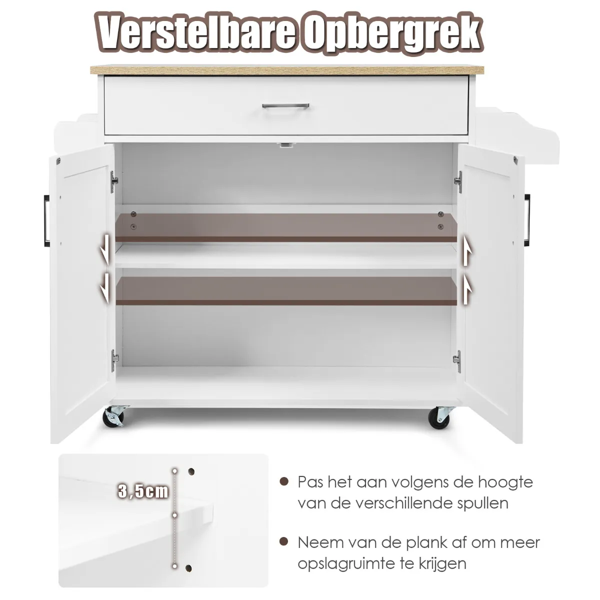 Verstelbare plank & ruim werkblad: 3-positie verstelbare plank in de onderste kast kan voldoen aan uw verschillende opslaghoogte eisen. U kunt de plank ook meenemen voor meer opbergruimte. Naast een breed aanrechtblad biedt deze keukenwagen u een ruim oppervlak voor het bereiden van voedsel.