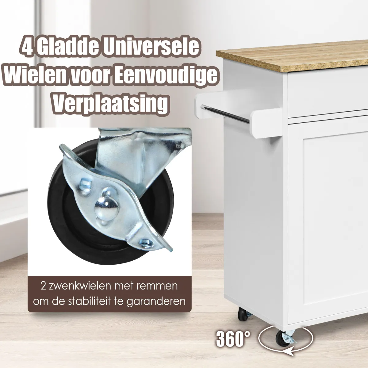Makkelijk te verplaatsen met 4 360° zwenkwielen, waarvan 2 met rem