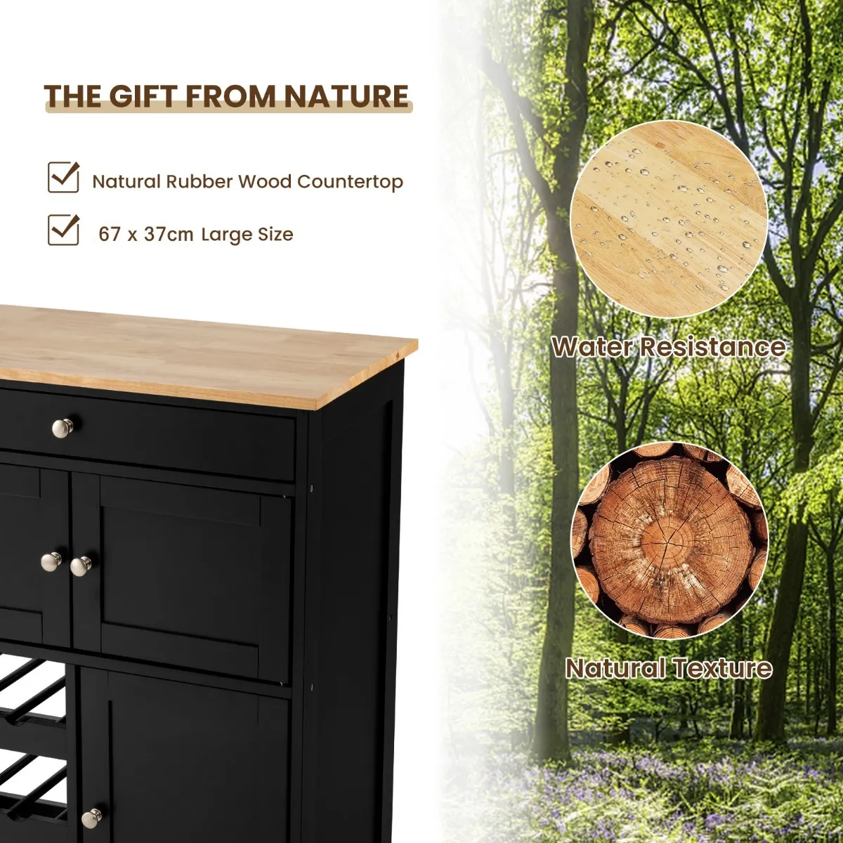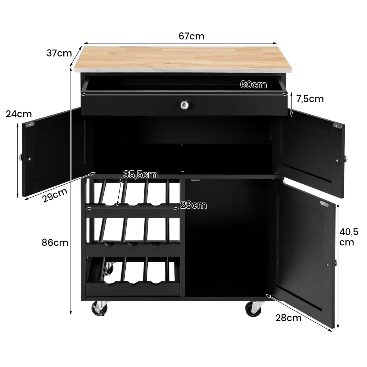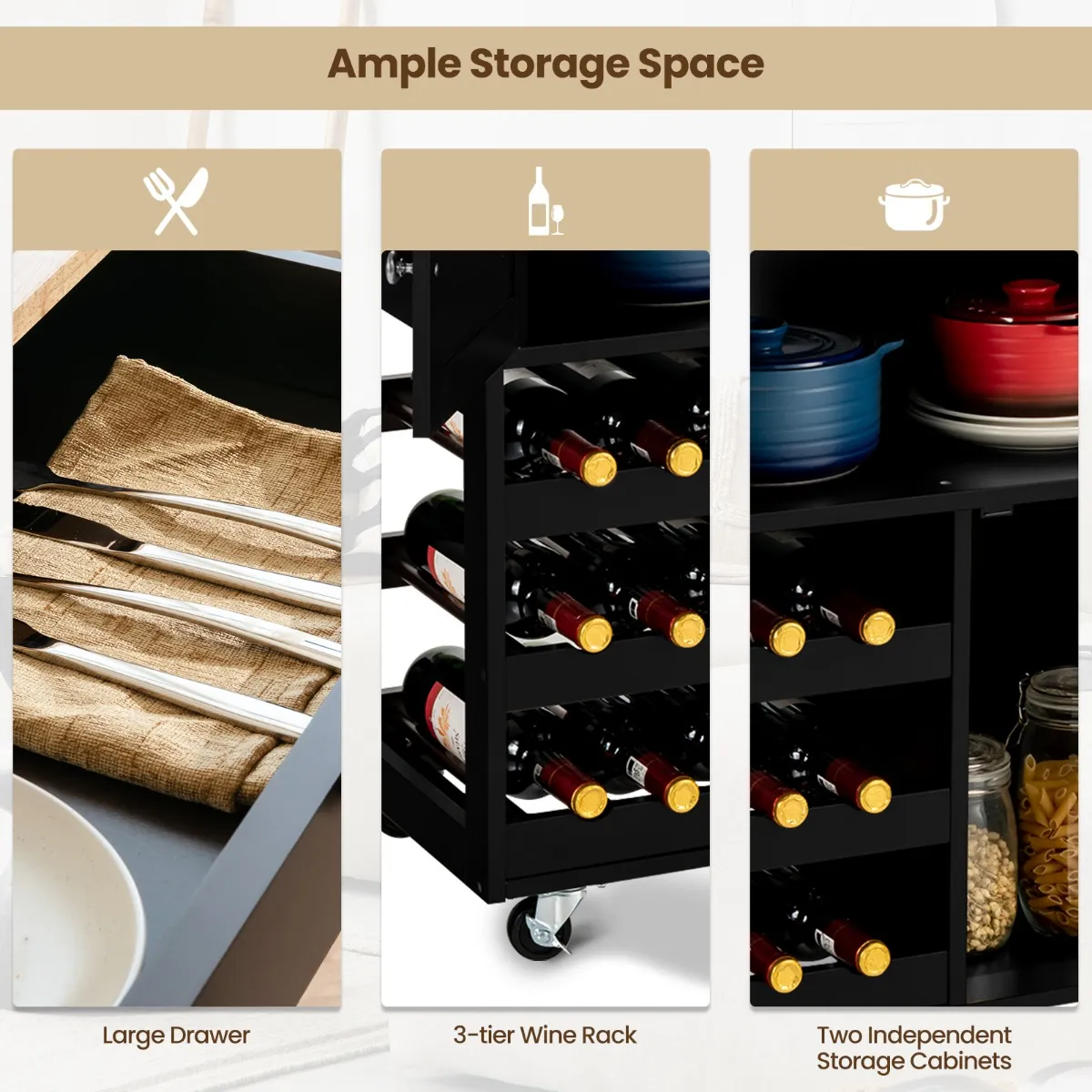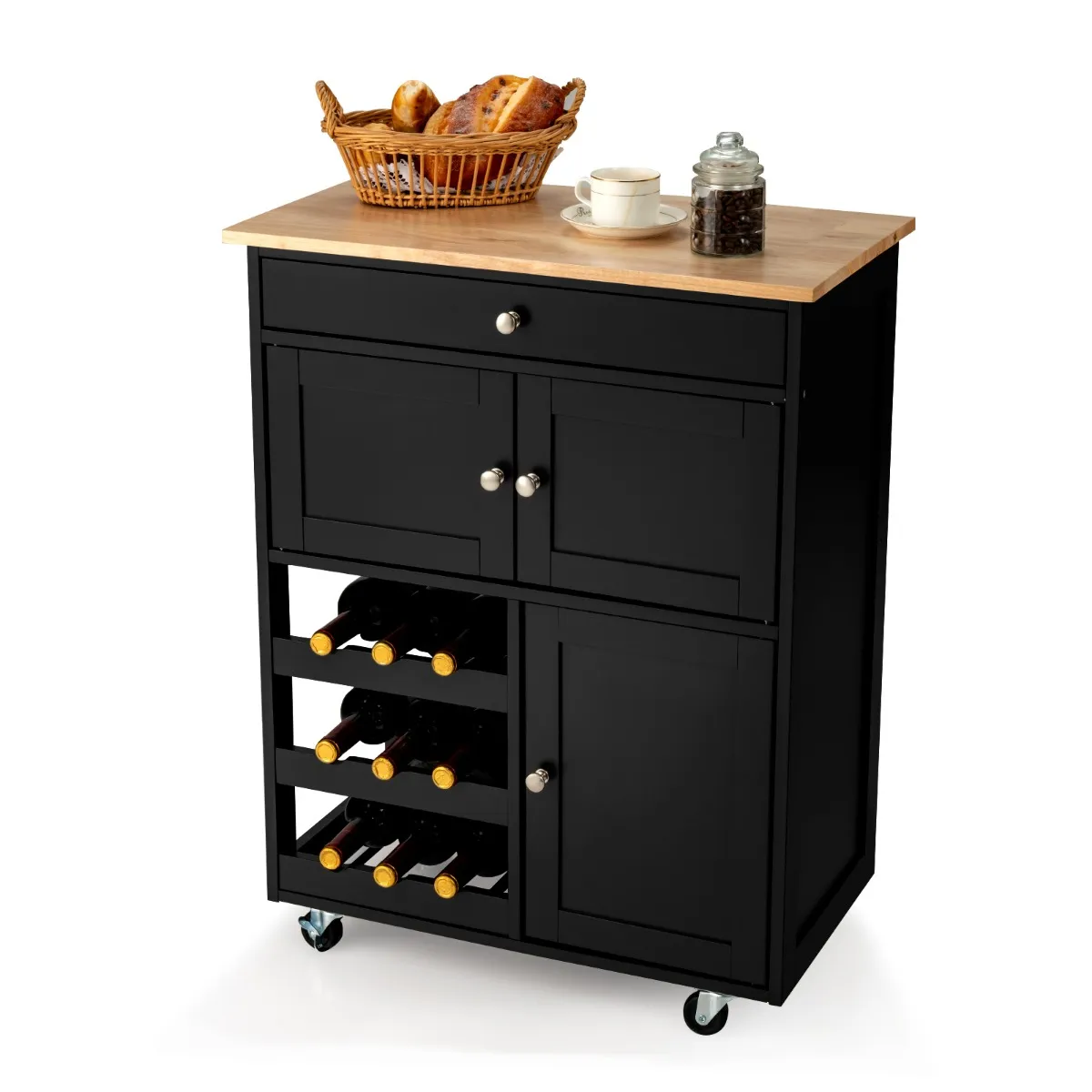 【Veelzijdige en ruime opbergruimte】Een ruim aanrecht van 67cm x 37cm biedt voldoende ruimte voor het bereiden van voedsel. Bovendien wordt de kar geleverd met een lade en twee kasten. Deze gevarieerde opslagruimte houdt al uw borden, keukenbenodigdheden, kruidenpotjes goed georganiseerd. En het 3 rijen wijnrek sorteert uw wijnen van verschillende soorten, en houdt ze ook binnen handbereik.