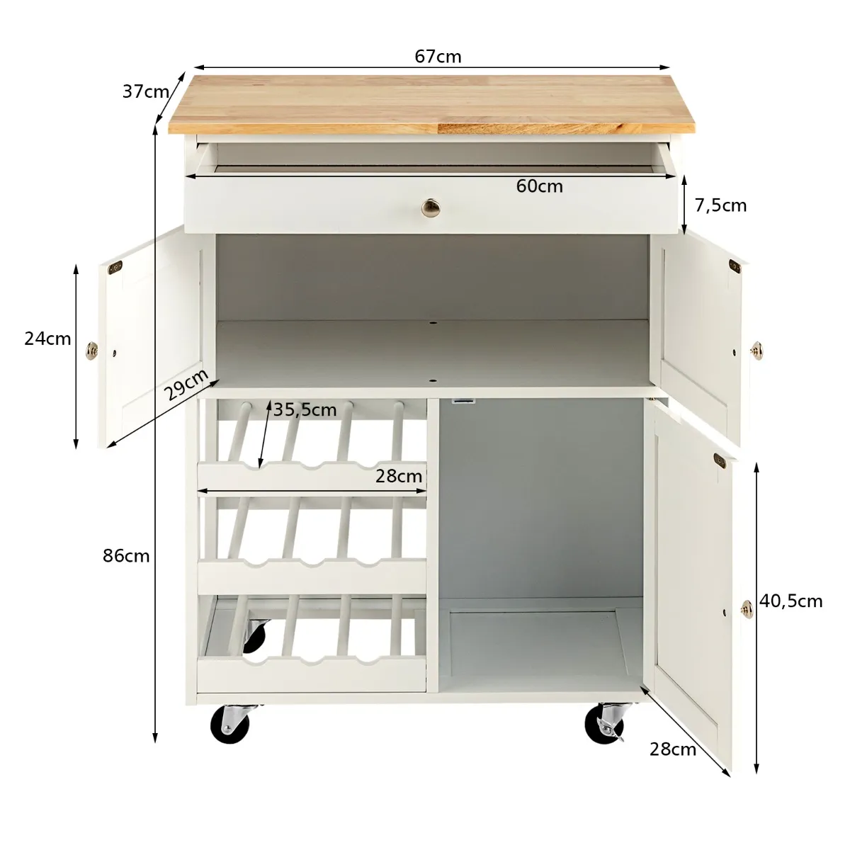【Veelzijdige en ruime opbergruimte】Een ruim aanrecht van 67cm x 37cm biedt voldoende ruimte voor het bereiden van voedsel. Bovendien wordt de kar geleverd met een lade en twee kasten. Deze gevarieerde opslagruimte houdt al uw borden, keukenbenodigdheden, kruidenpotjes goed georganiseerd. En het 3 rijen wijnrek sorteert uw wijnen van verschillende soorten, en houdt ze ook binnen handbereik.