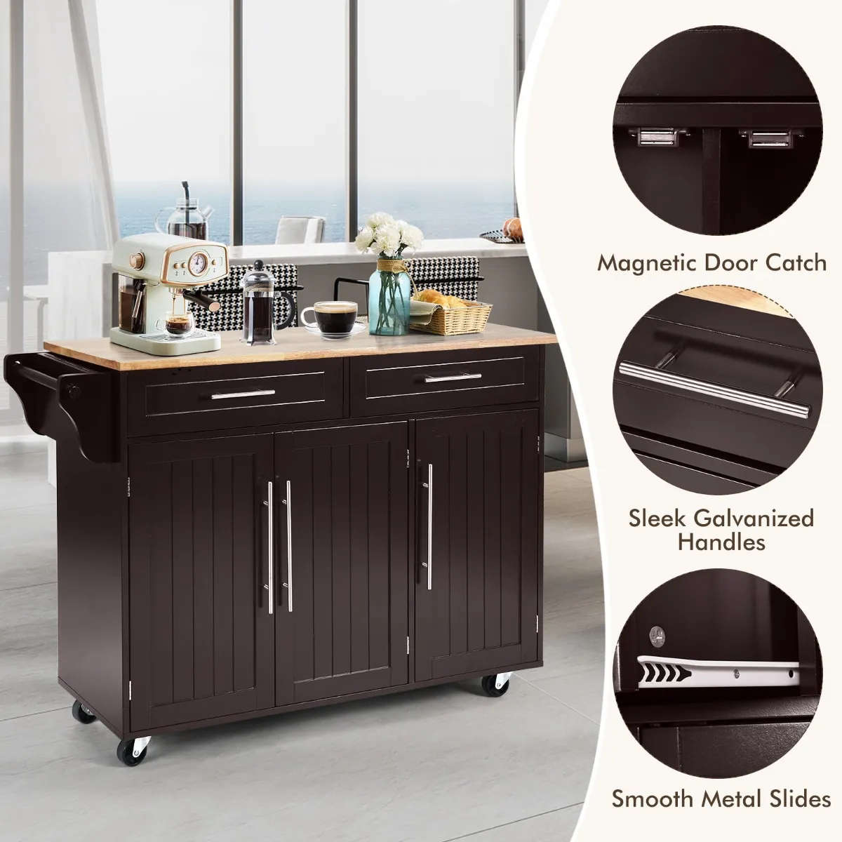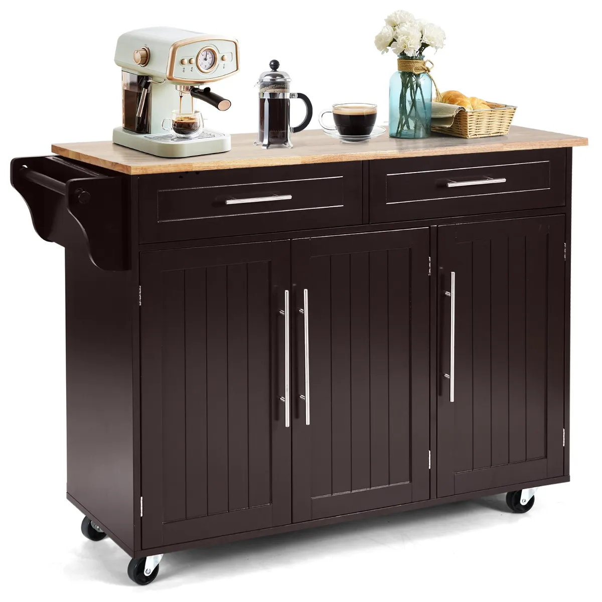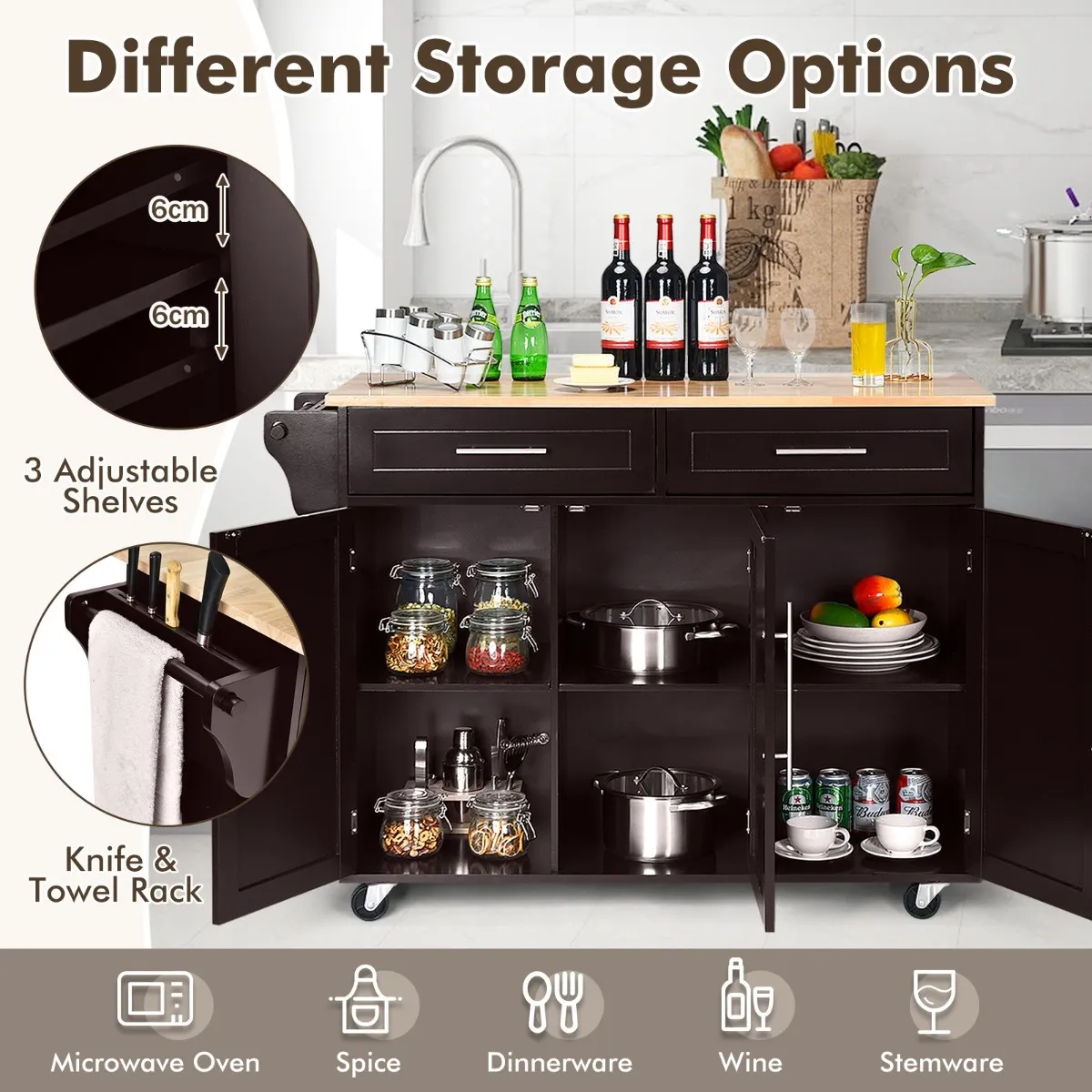 Met 2 grote lades, 2 kasten en een groot werkblad biedt het roleiland je voldoende opbergruimte voor eten, servies, kopjes, enz. De planken in de kast kunnen in 3 standen worden versteld voor verschillende items. Bovendien is de trolley gemaakt van hoogwaardig rubberhout en MDF, waardoor hij duurzaam en stevig genoeg is. En je kunt zonder zorgen je maaltijden bereiden op het waterdichte werkblad. Het keukeneiland is uitgerust met 4 universele zwenkwielen, waarvan 2 geremd, en vormt zo de perfecte balans tussen praktische mobiliteit en hoge veiligheid. Bovendien zorgen de handdoek- en messenhouders voor extra netheid en veiligheid. Als je op zoek bent naar een functionele organizer voor je keuken, dan is dit keukeneiland een perfecte keuze.