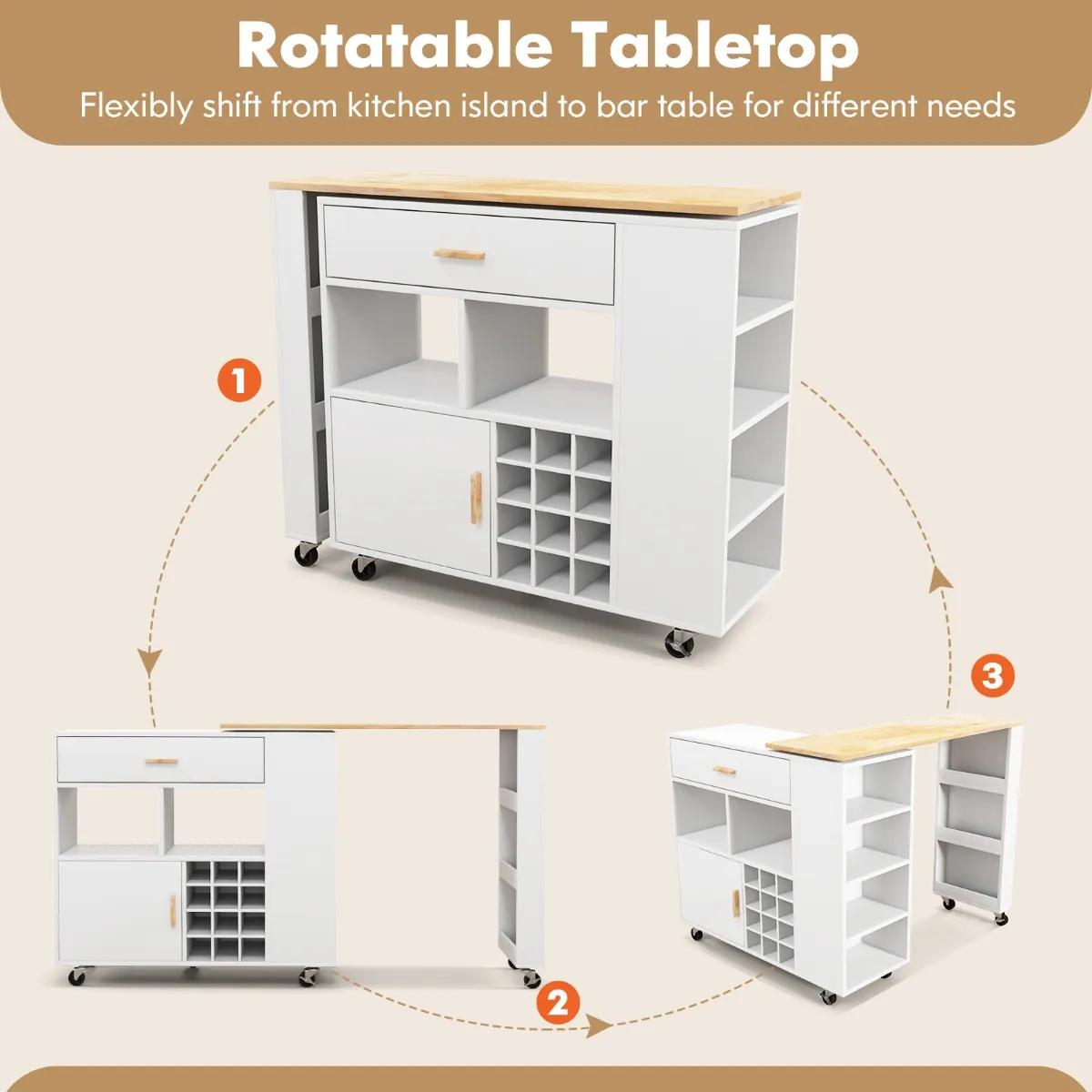2-in-1 keukenwagen:Â Dit keukeneiland kan niet alleen als mobiele serveerwagen, maar ook als werkplek voor het bereiden van gerechten worden gebruikt. Het draaibare tafelblad biedt relatief veel gebruiksgemak, zodat je naar behoefte flexibel van keukeneiland naar statafel kunt wisselen. Opmerking: de verzending gebeurt in 2 dozen.