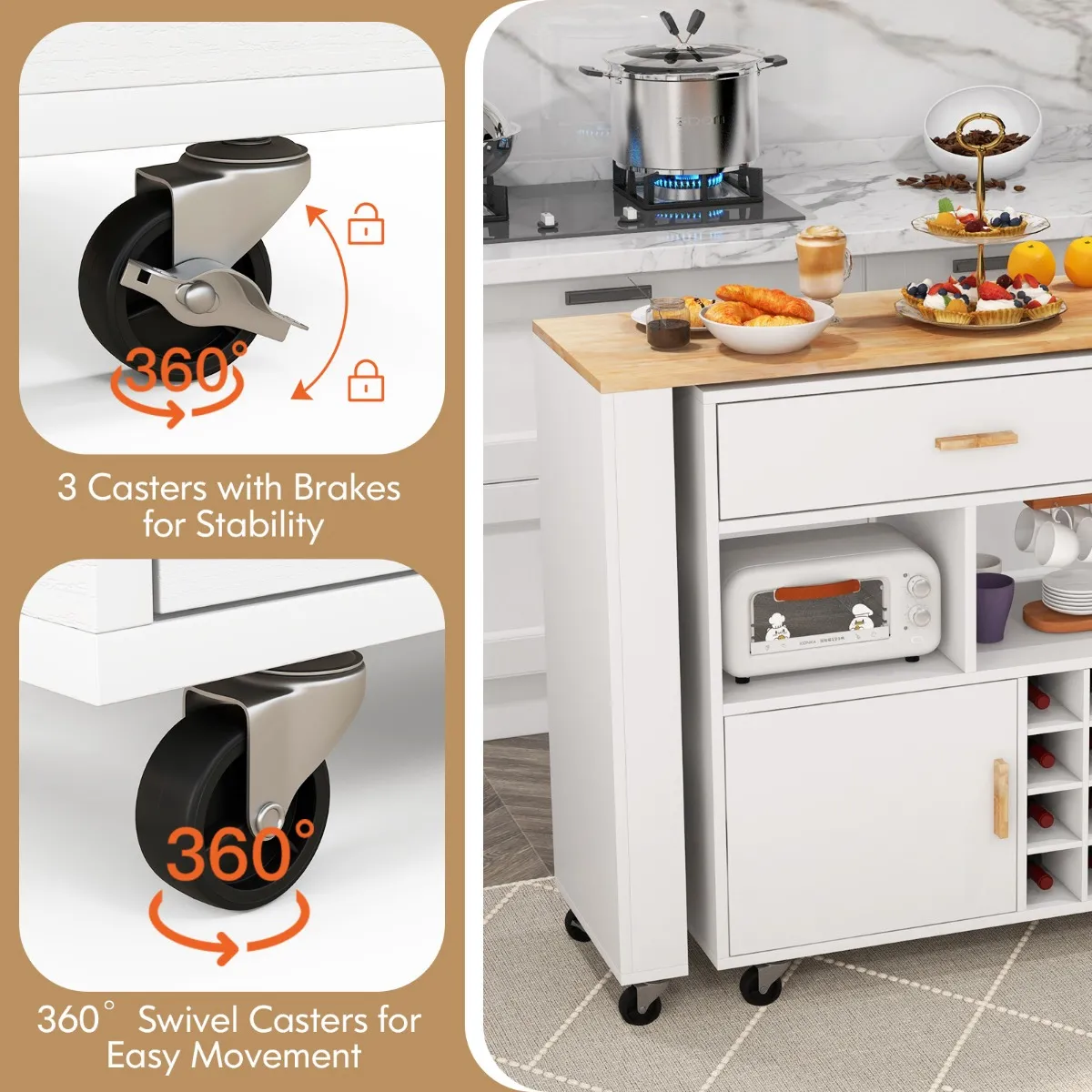 Vergrendelbare wielen en opmerkelijke details: Uitgerust met 7 soepel lopende wielen kan de keukentrolley gemakkelijk overal mee naartoe worden genomen. En 3 wielen met remmen zorgen ervoor dat de wagen op zijn plaats blijft. Uitgerust met gladde metalen rails en metalen scharnieren kunnen de lade en kast gemakkelijk en geruisloos worden geopend.