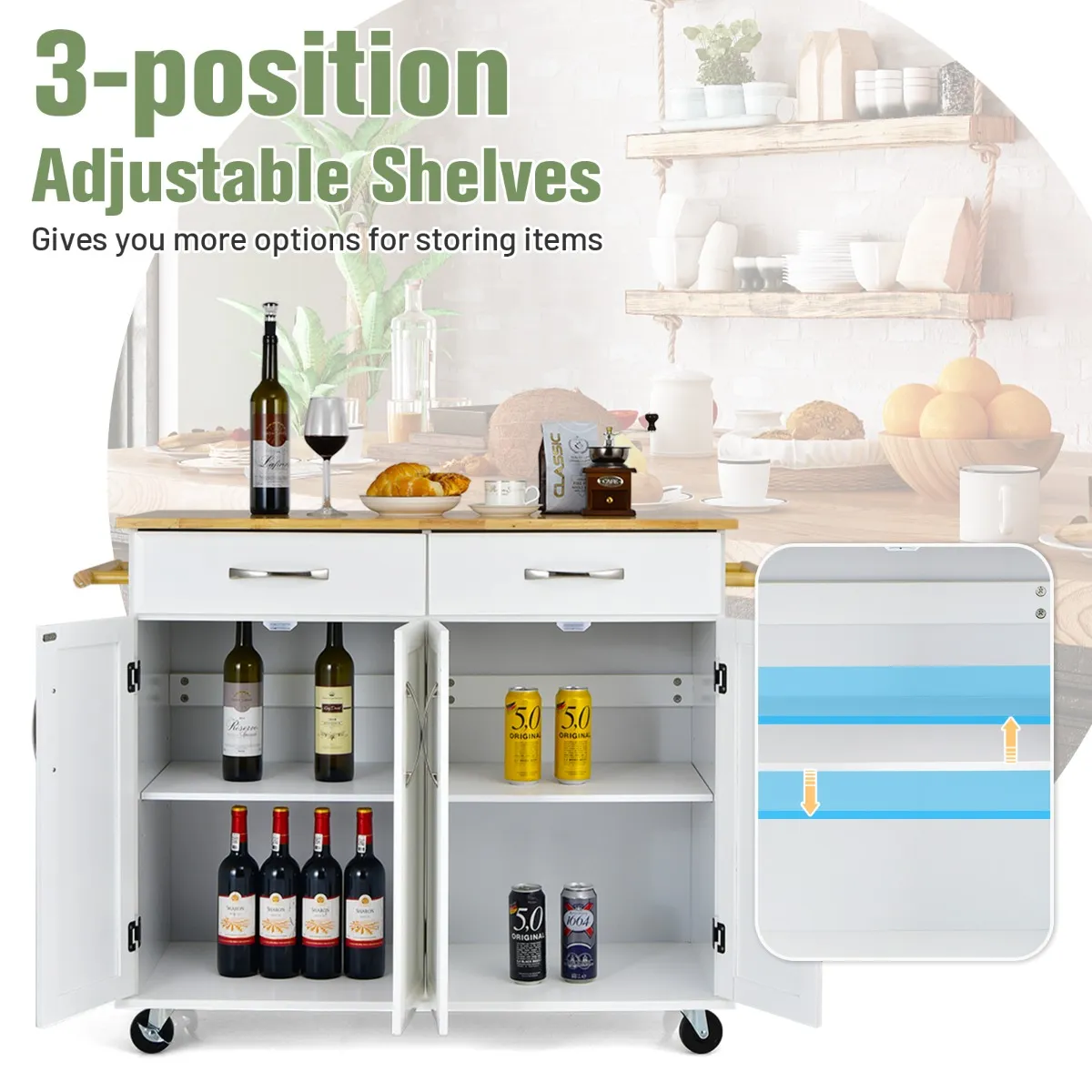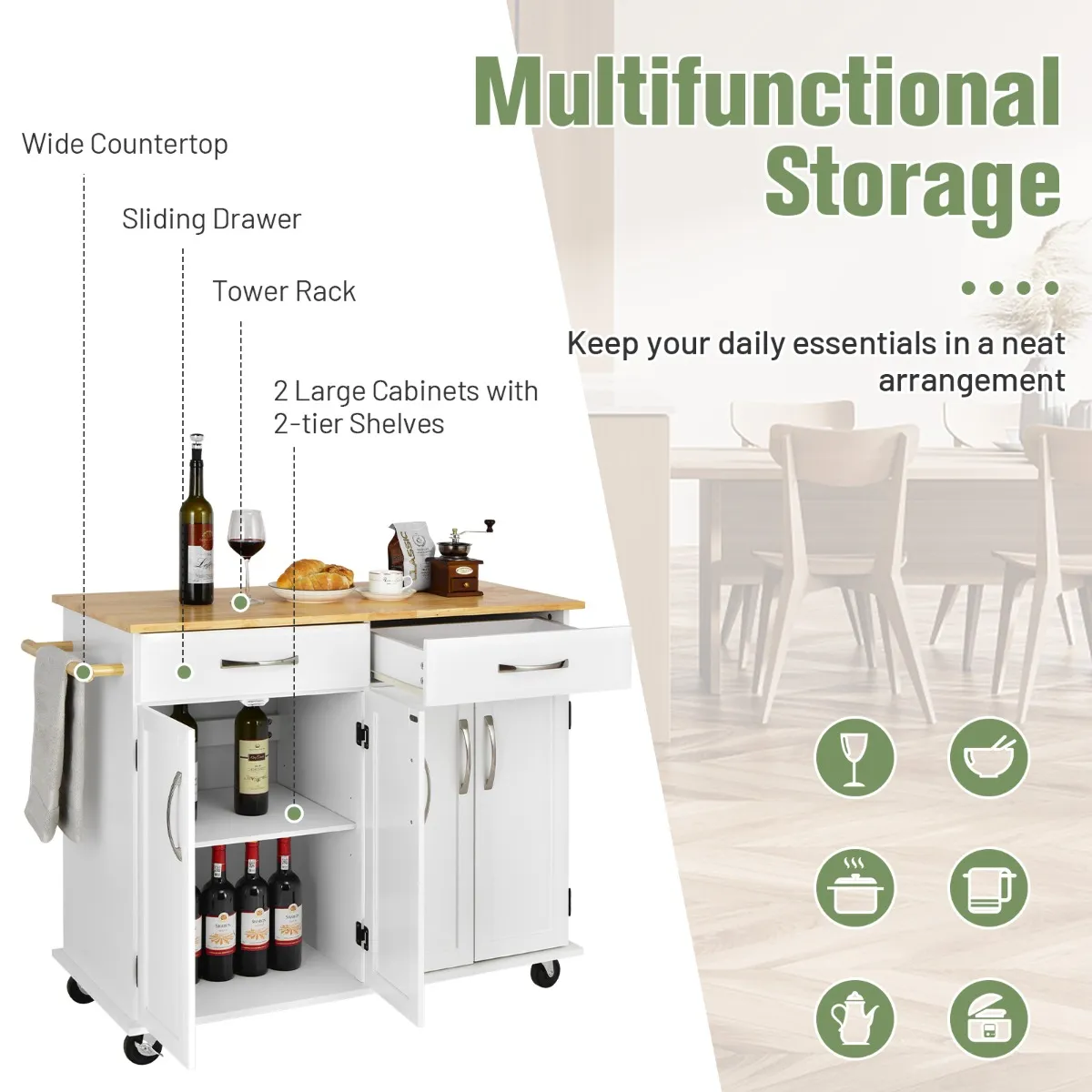 De eigentijdse keukentrolley heeft een groot aanrechtblad, 2 lades, 2 handdoekrekken en 2 kasten met 2 verstelbare planken, waardoor je verschillende opbergmogelijkheden hebt voor een goed georganiseerde keuken. De trolley is gemaakt van kunsthouten panelen, MDF en een ondersteuning van grenenhout voor een lange levensduur. Het verdikte rubberhouten aanrechtblad met uitstekende draagkracht geeft je spullen extra ondersteuning. 4 soepele wielen (waarvan 2 vergrendelbaar) zorgen voor een soepele beweging en veiligheid.