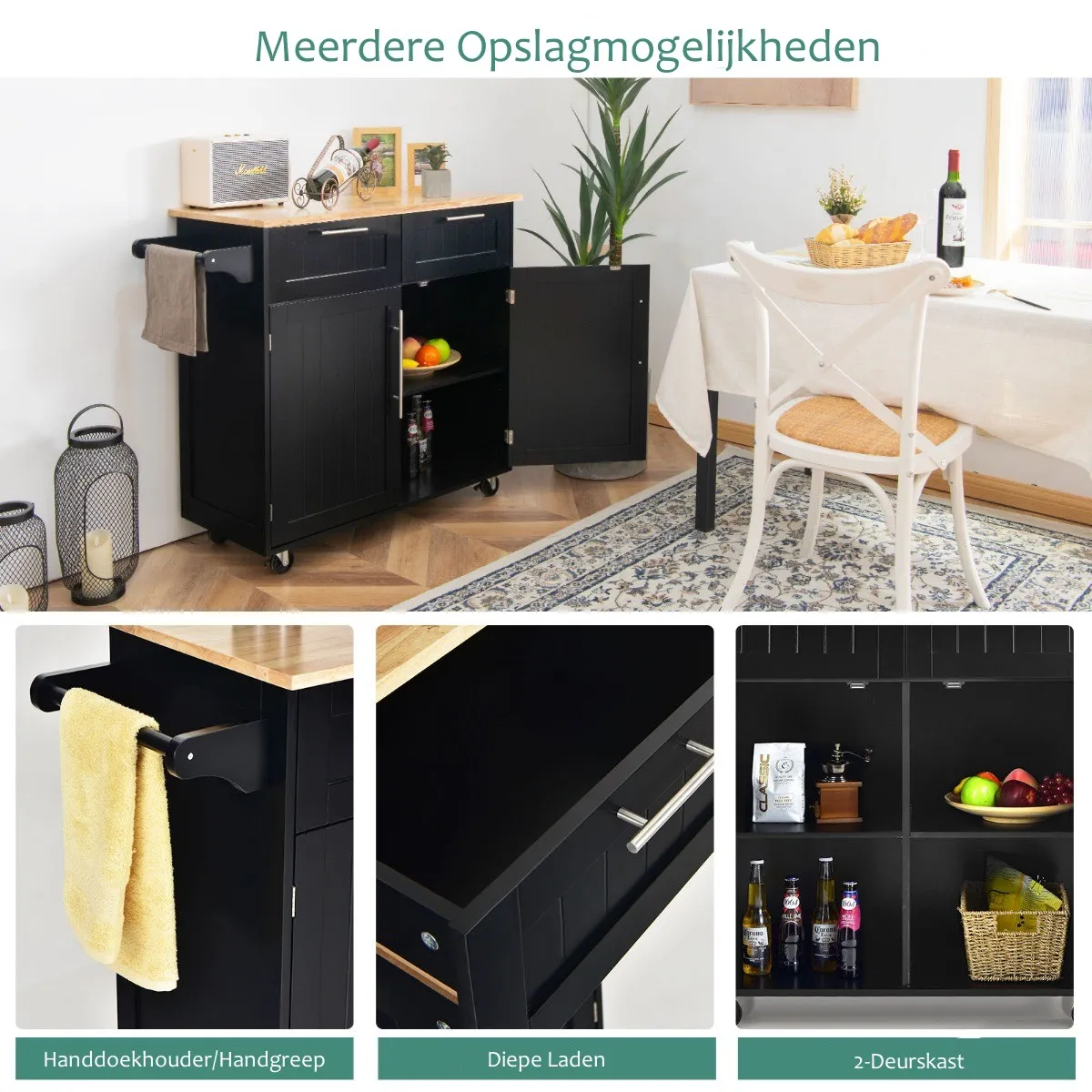 Veel opbergruimte: Uitgerust met 2 diepe laden en 2 grote kasten biedt onze keukenwagen u voldoende opbergruimte voor diverse keukenbenodigdheden zoals borden, pannen en potten. Bovendien helpt een handdoekhouder aan één kant u om uw handdoek bij de hand te houden en de trolley moeiteloos te duwen.