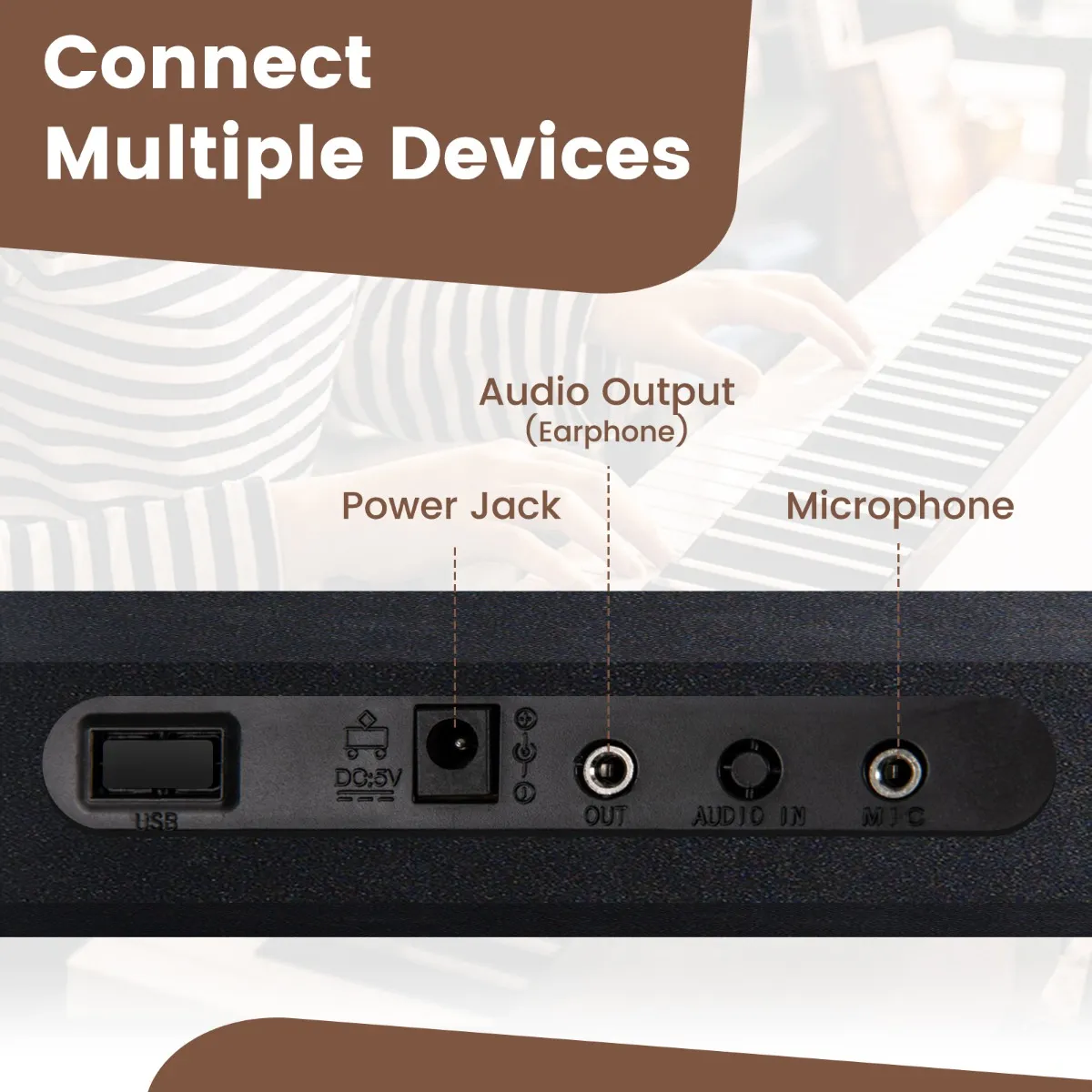 [2 voedingsopties]: Het draagbare toetsenbord kan via de voeding of 4 AA-batterijen (niet meegeleverd) van stroom worden voorzien. Het zorgt ervoor dat je muziek niet wordt onderbroken, of je nu thuis oefent of onderweg speelt.