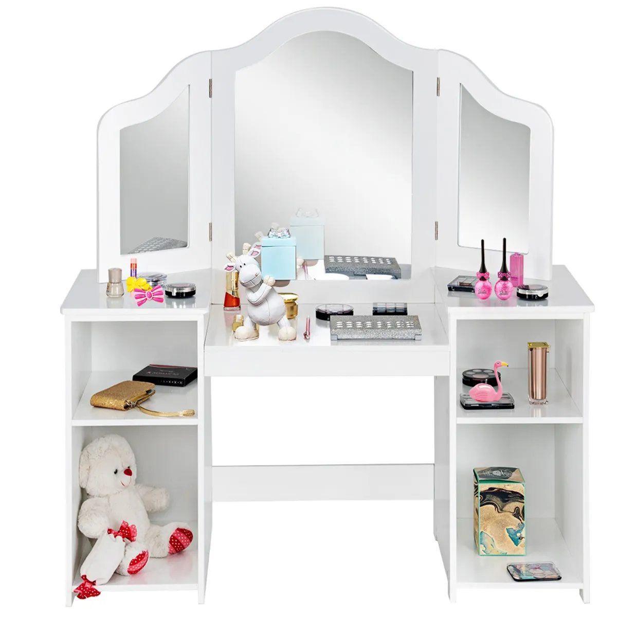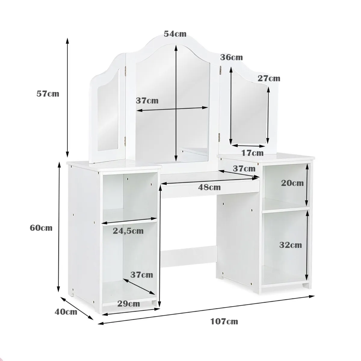 Deze kaptafel is speciaal ontworpen voor kinderen. Onze kinderen kaptafel is niet alleen een stuk speelgoed, het is ook zeer praktisch. Geïmiteerd uit de volwassen kaptafel, het heeft een drie-zijdige spiegel, volledige en duidelijke beeldvorming en het heeft een groot aantal opslagruimte voor het opslaan van al hun favoriete mode-accessoires en speelgoed. Laat de kinderen een goede gewoonte ontwikkelen om dingen te organiseren tijdens het spelen. Als u van uw kleine meisje houdt, stuur haar dan een kinder ijdelheidstafel en geef uw meisje een prinses-achtige ervaring.