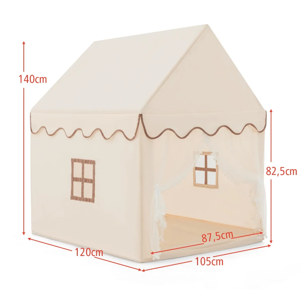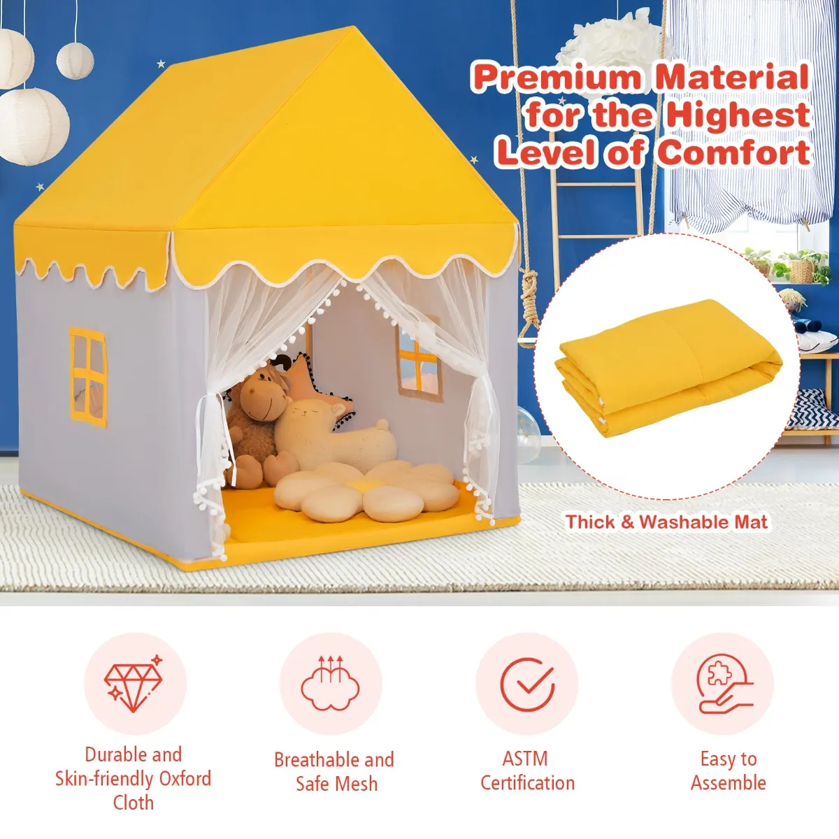 Net als een echt huis, is het groot genoeg voor uw kinderen om hun eigen privéruimte zowel binnen als buiten te creëren. Gemaakt van massief hout, is dit speelhuis stabiel genoeg zonder wiebelen of vervorming. Zachte en dikke mat wordt meegeleverd voor het creëren van een super comfortabel zitgevoel. De schattige deur en ramen zijn niet alleen ter decoratie, maar ook voor de luchtcirculatie. En het hele huis is bedekt met niet-giftig en geurloos oxford doek, en u kunt er zeker van zijn dat uw kinderen altijd in een veilige omgeving zullen zijn.