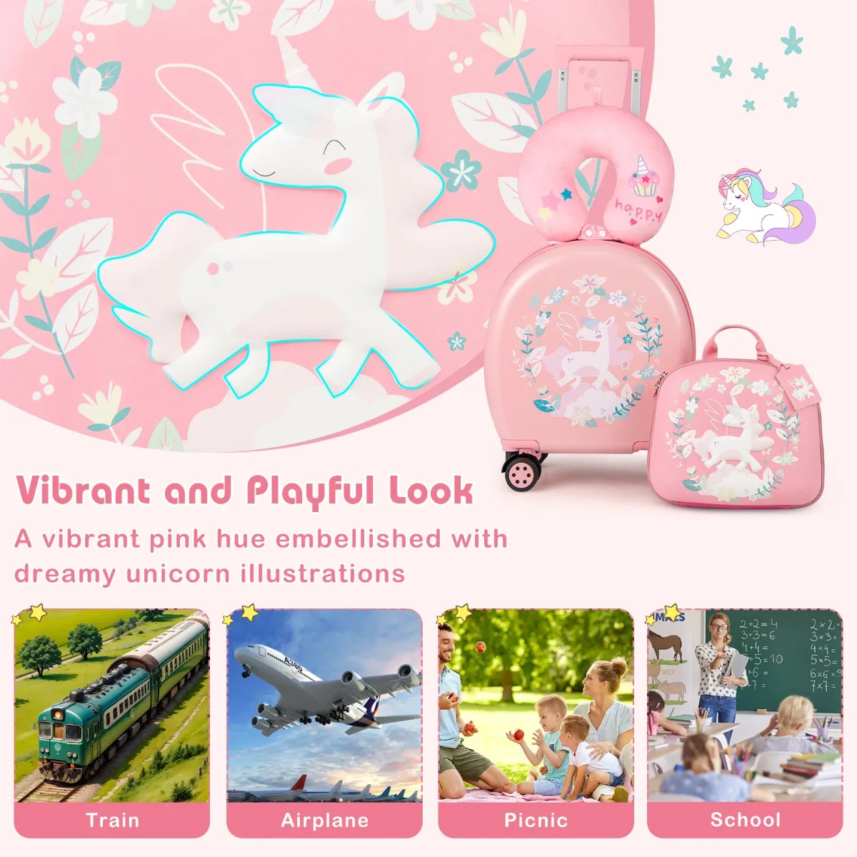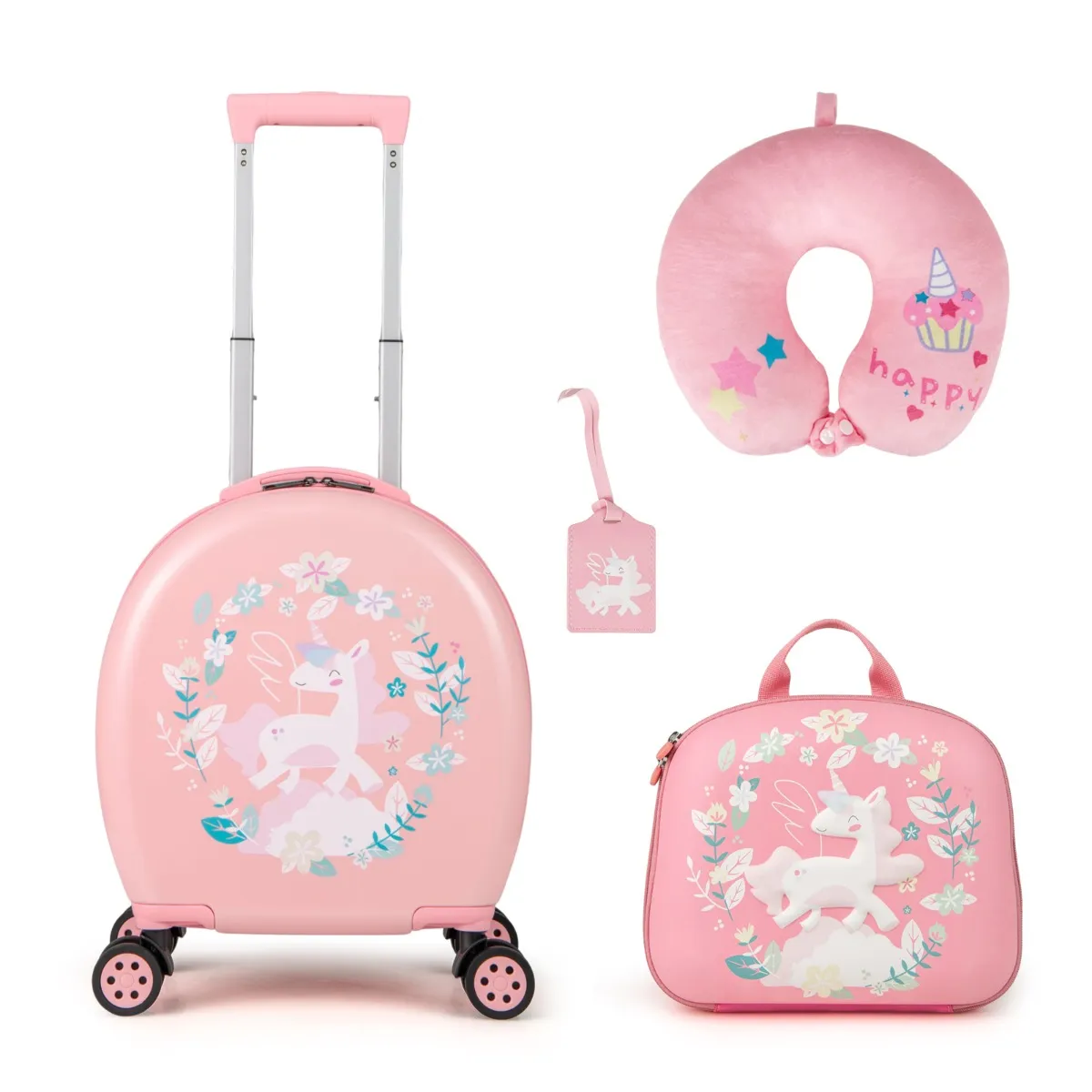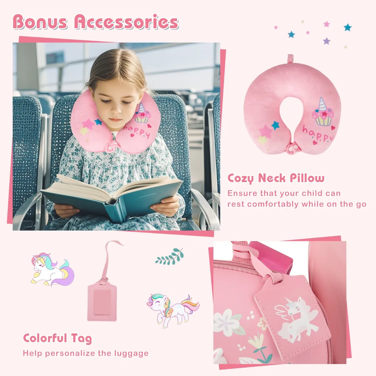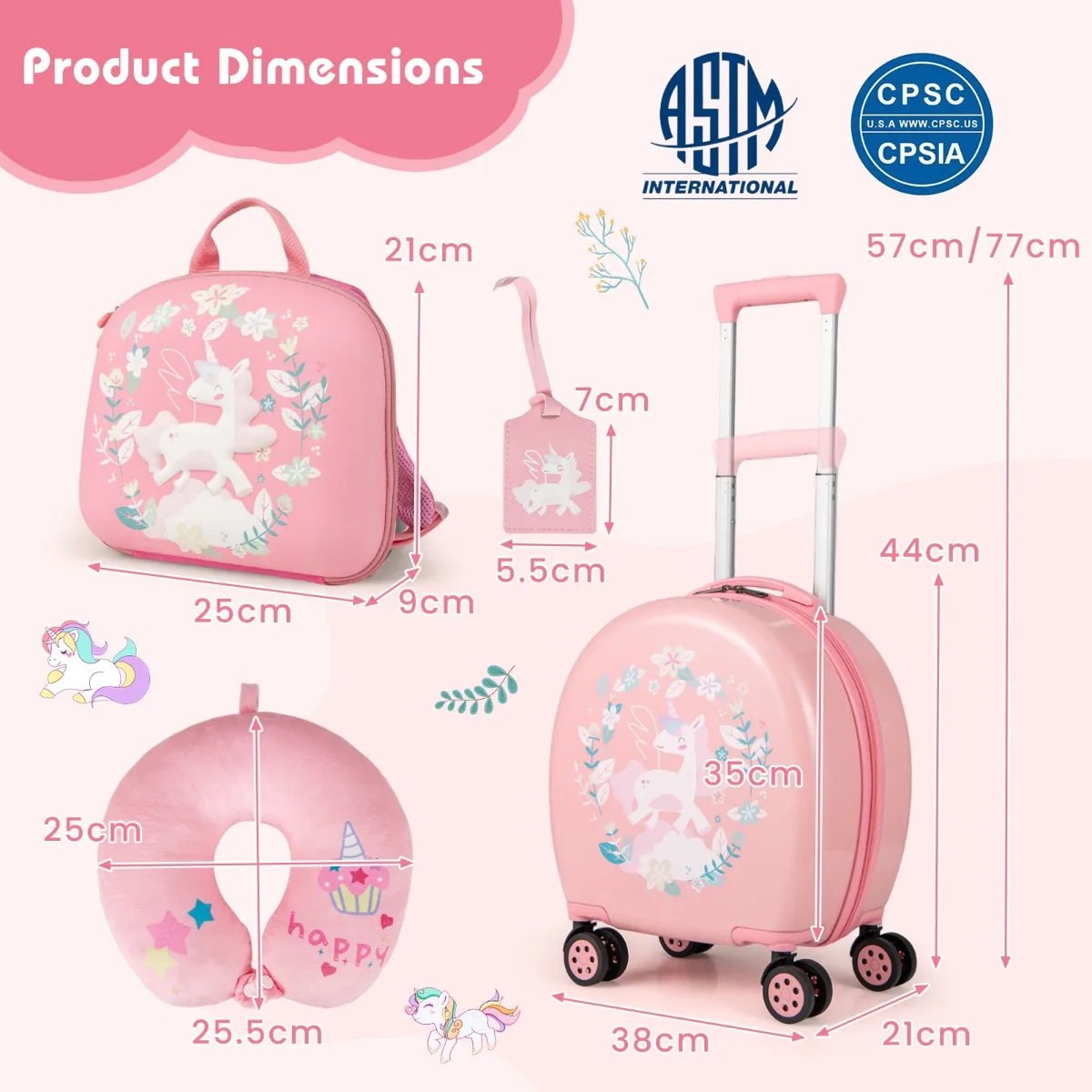 Kinderbagageset 4-Delige Kofferset Met Handbagage Rugzak Nekkussen Bagagelabel Cadeau Roze