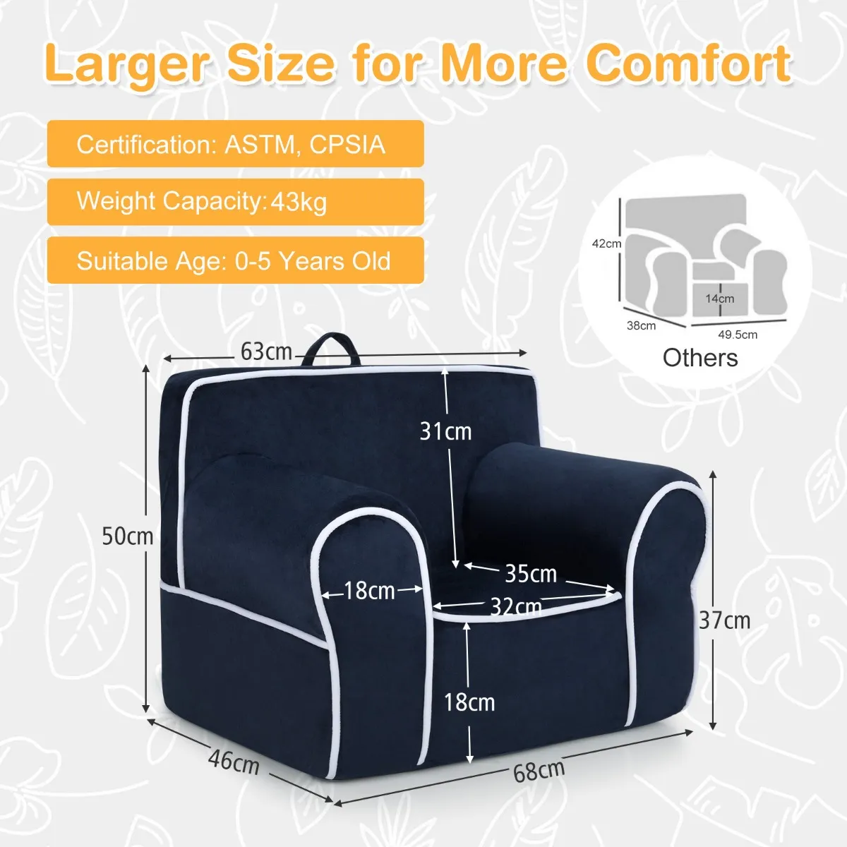 Duurzame en veilige constructie: Het stabiele schuimrubberen frame kan tot 43 kg dragen en is daarom geschikt om op te zitten voor kinderen van 0 tot 5 jaar. De stoel zal niet wiebelen of vervormen, terwijl je kleintje erop zit. Vanwege de zachte randen bestaat er ook geen risico op letsel.