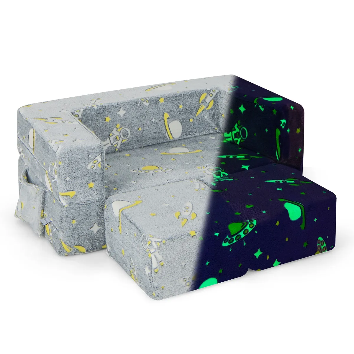 Ons modulaire bankstel is gemaakt van veilige materialen en is ontworpen om kinderen te ondersteunen terwijl ze groeien. De uitklapbare sofa’s bieden eindeloze combinaties en ontwikkelen de verbeelding en creativiteit van kinderen. Als de sofa 15 minuten wordt blootgesteld aan zonlicht of fel binnenlicht, gloeit hij op in het donker. Kinderen zullen dol zijn op het heldere ontwerp. De hoogwaardige fluwelen hoes is zacht tegen de huid, bestand tegen slijtage en vlekken, en machinewasbaar voor extra comfort en gemak.