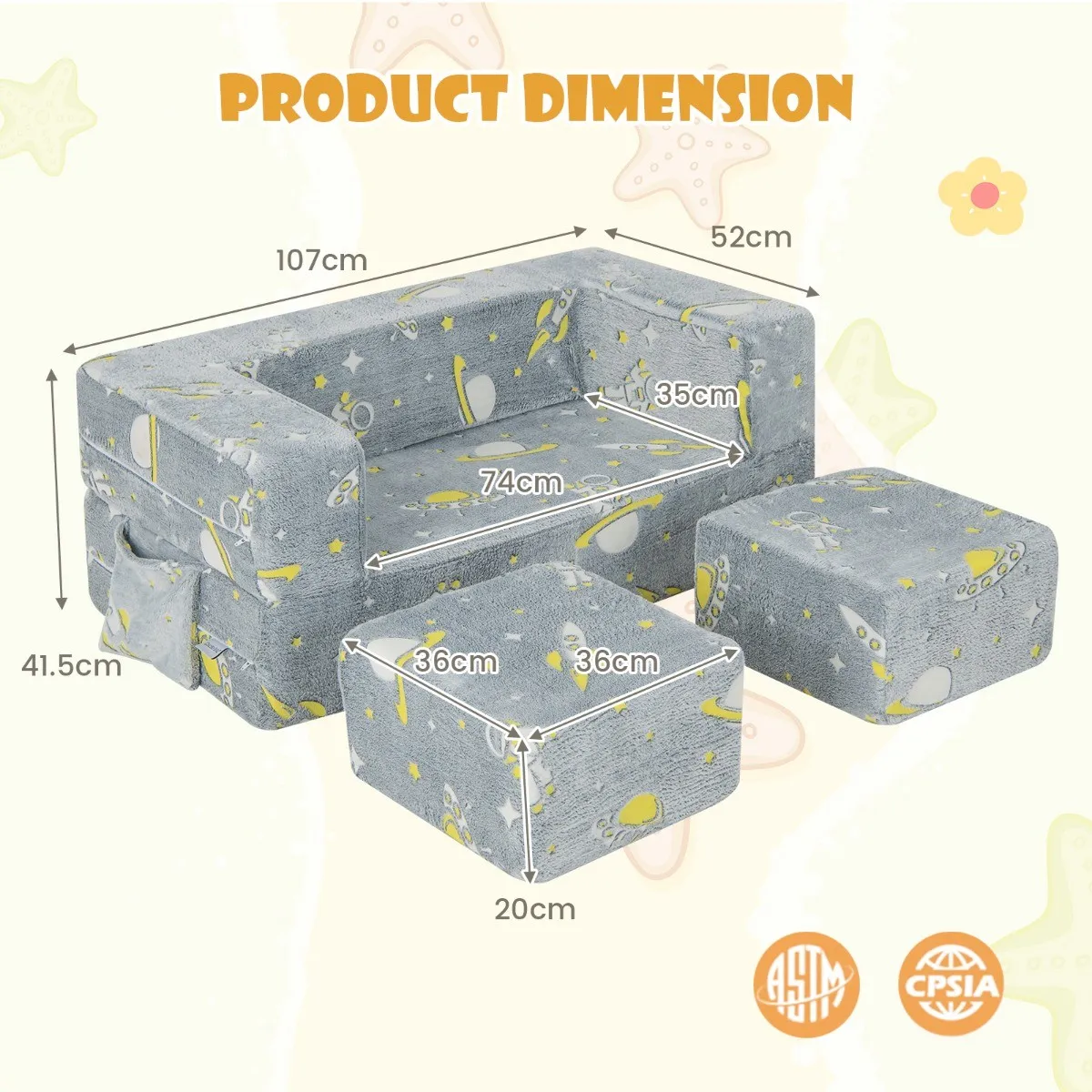 【Uniek lichtontwerp】: Als het bankstel 15 minuten wordt blootgesteld aan zonlicht of fel binnenlicht, zal het bankstel in het donker oplichten. Als gevolg daarvan kunnen peuters genieten van een visueel van ruimte-thema patronen, dat is heel aantrekkelijk. Deze peuterbank is een ideaal cadeau voor verjaardagen en Kerstmis.