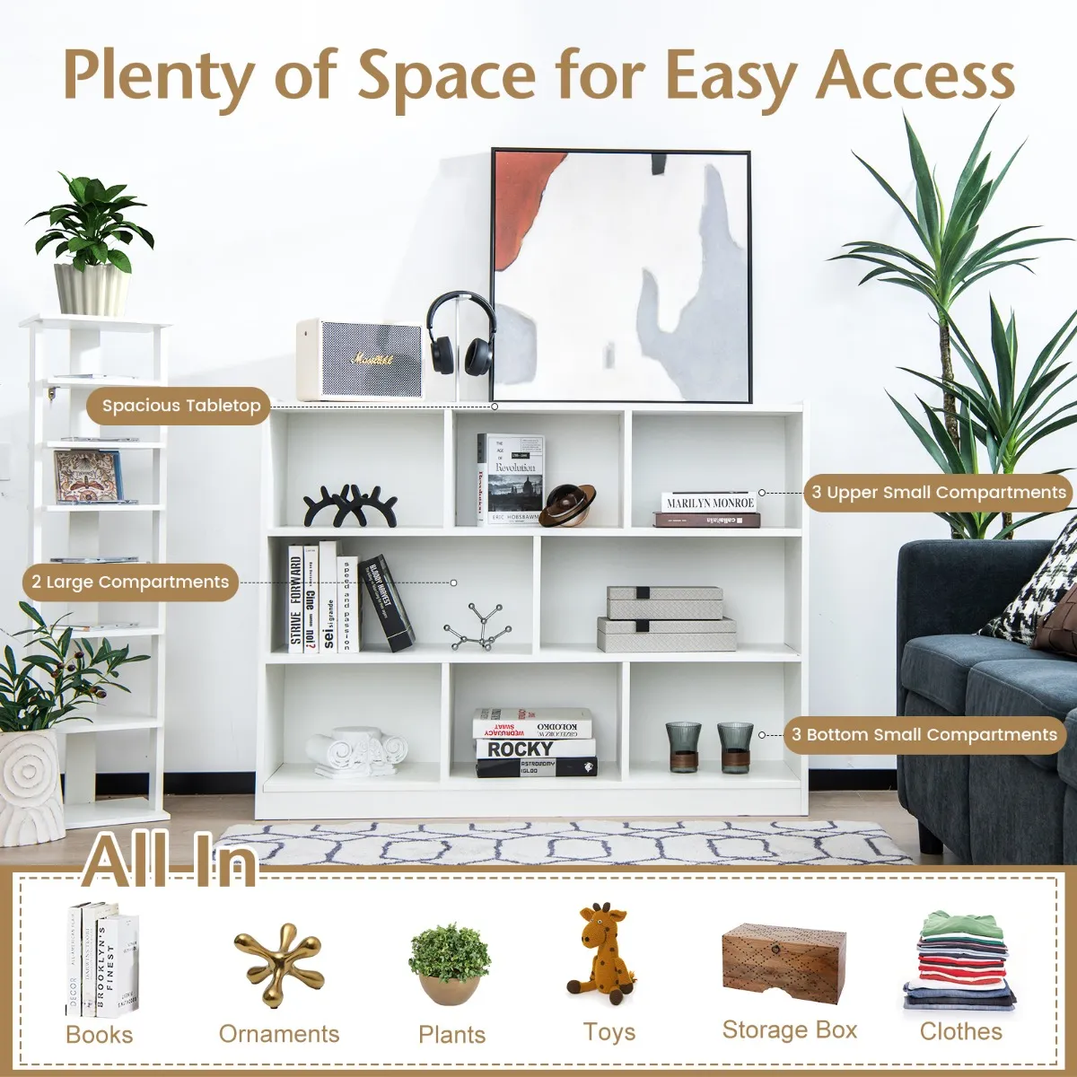 Onze boekenkast met 3 niveaus heeft 8 vakken voor het opbergen van alledaagse benodigdheden in verschillende secties, wat goed kan passen bij jouw opslagbehoeften. De brede bovenkant van de kast is een perfect platform voor het uitstallen van decoratieve voorwerpen. Hij is gemaakt van duurzaam gelamineerd hout en MDF, waardoor hij stevig en betrouwbaar is voor langdurig gebruik. Met zijn eenvoudige, moderne ontwerp voegt hij charme toe aan woonkamers, slaapkamers en kantoren. Het is een praktische opbergoplossing voor het organiseren van je spullen, of je hem nu gebruikt als boekenkast of als plank.