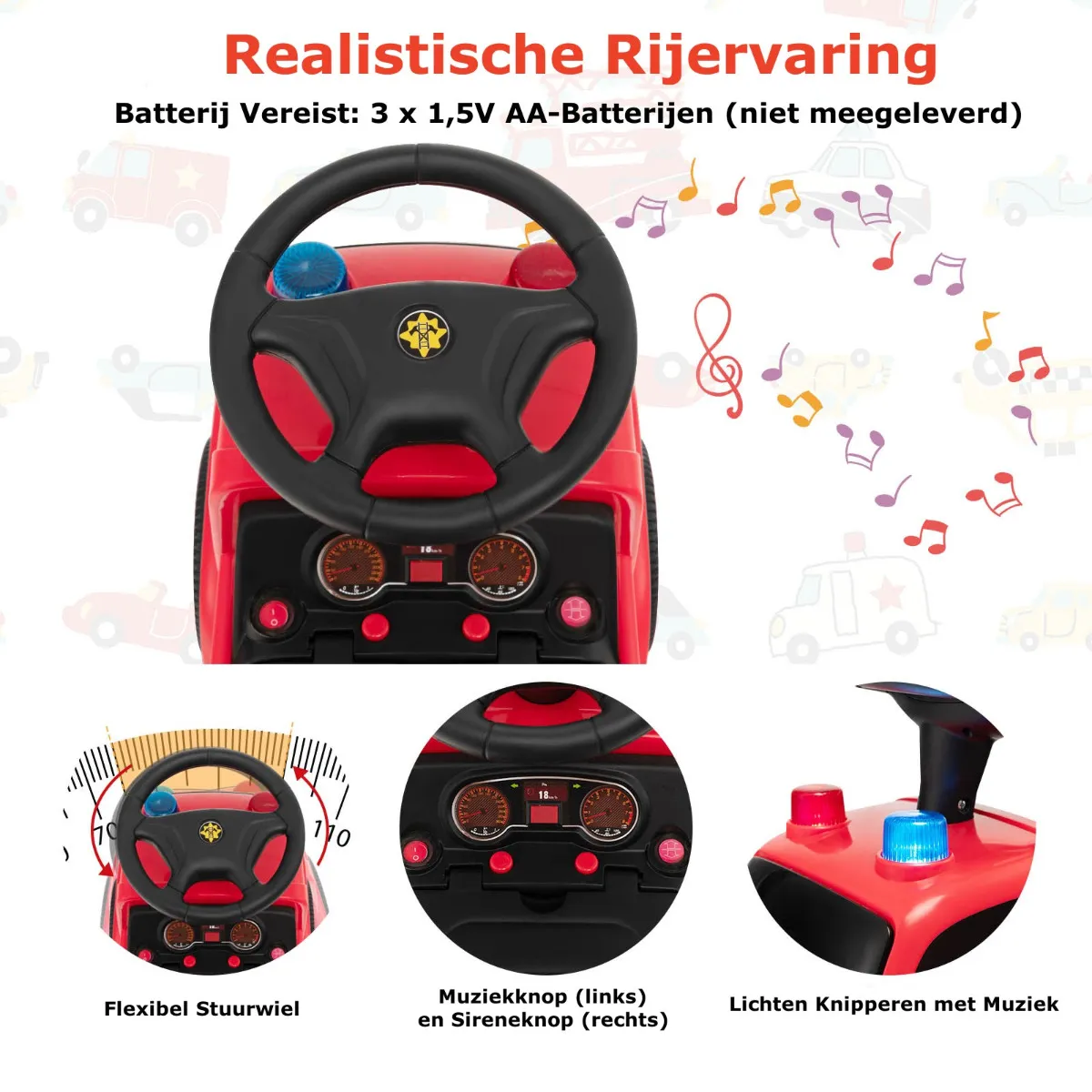 Deze ride-on brandweerwagen brengt meer plezier en genot voor uw kleintjes. Met het uiterlijk van een rode brandweerauto, een stuurwiel, authentiek sirenegeluid en koplampen biedt deze kinderrijtuig uw kinderen een realistische rijervaring. Naast zijn functie als gewone kinderauto kan hij ook bellen blazen. De ladder blaast bellen uit na het toevoegen van bellenvloeistof en het indrukken van de knop. Bovendien maken de duurzame en anti-slip wielen deze speelgoedtruck geschikt voor diverse wegen. Tijdens het rijden worden de benen van de kinderen geoefend en worden hun motorische vaardigheden ontwikkeld. Aarzel dus niet om uw kinderen deze brandweerwagen te geven zodat ze de wereld kunnen verkennen!