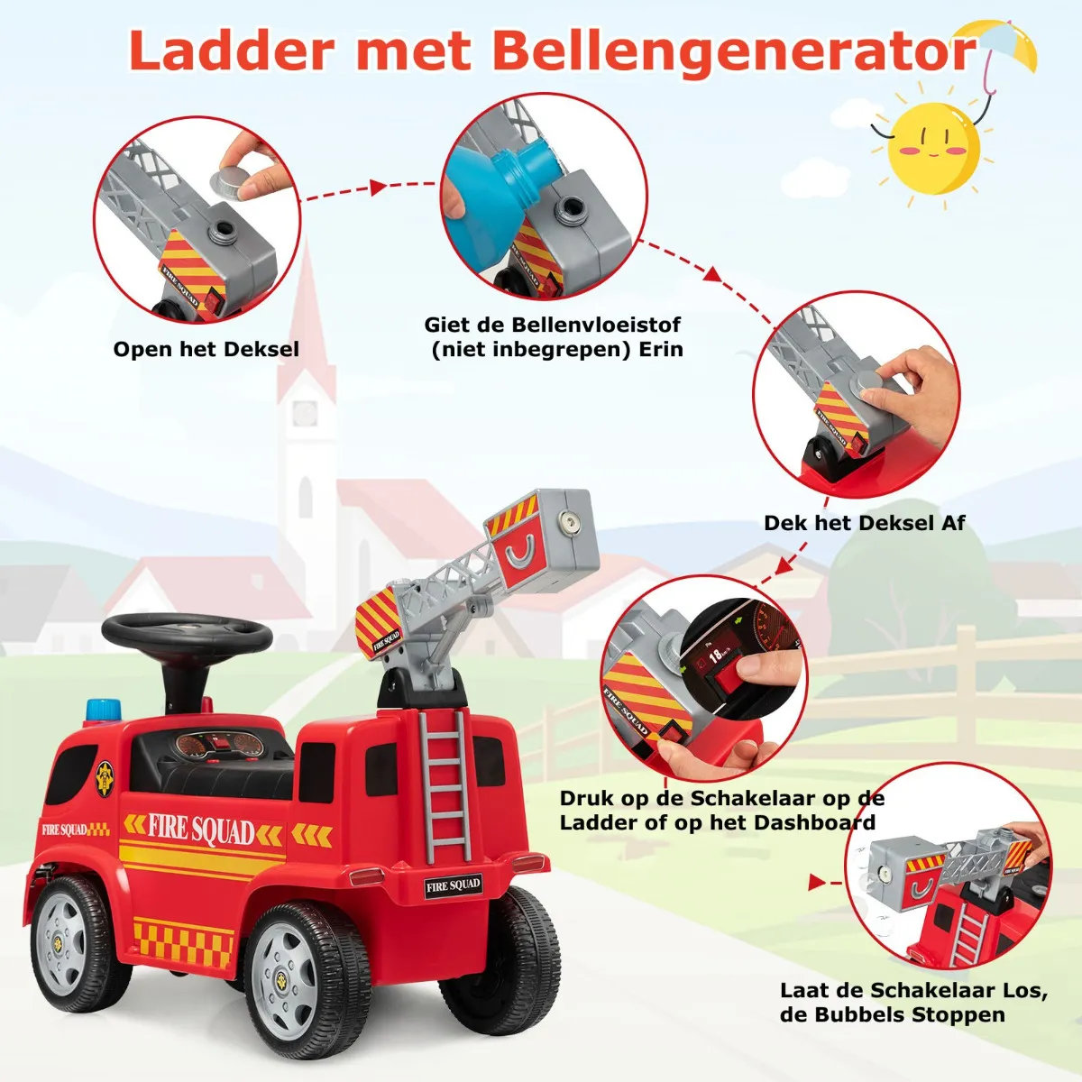 Ladder met bellenpistool: Deze mobiele brandweerwagen combineert ladder en bellenpistool en brengt meer plezier aan kinderen. Giet gewoon de bellenvloeistof (niet inbegrepen) erin en druk op de schakelaar op de ladder of het dashboard en de ladder blaast kleurrijke bellen.