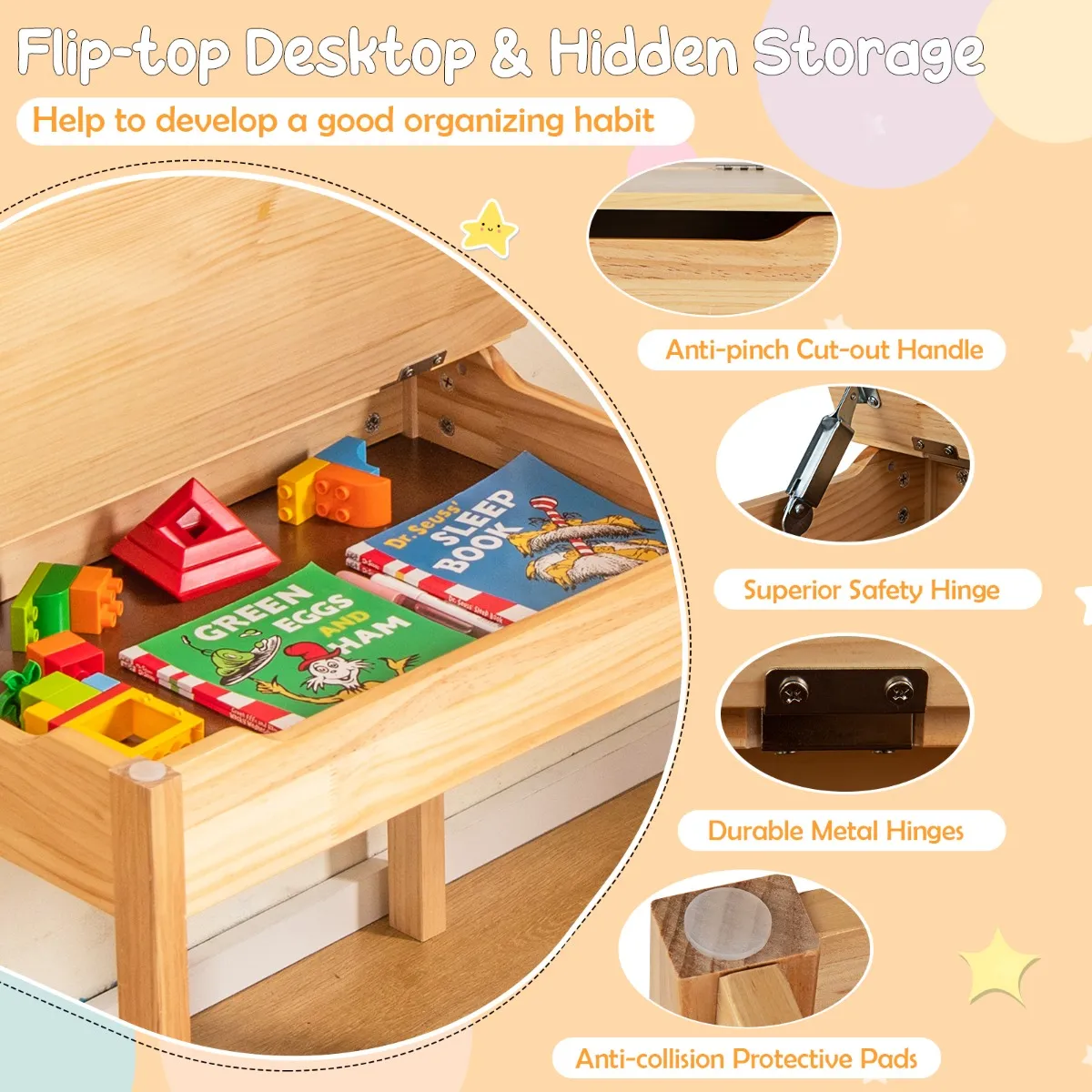 Extra ruimte: Ontworpen met een neerklapbaar blad, biedt deze activiteitentafel binnenin opbergruimte voor kantoorbenodigdheden, boeken, schildergereedschap en speelgoed, waardoor het blad schoon en netjes blijft.