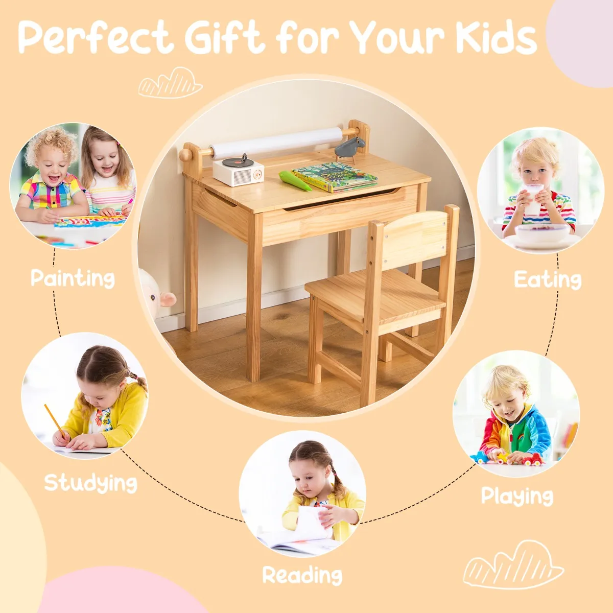Deze tafel en stoel set creëert een comfortabele omgeving voor kinderen om te genieten van een verscheidenheid aan activiteiten. De papierrolhouder is ontworpen om de papierrol vast te houden en je kunt hem gemakkelijk verwijderen om hem te vervangen. Open de lade en er is genoeg ruimte binnenin voor vaak gebruikte kantoorbenodigdheden, boeken, schildergereedschap en meer.