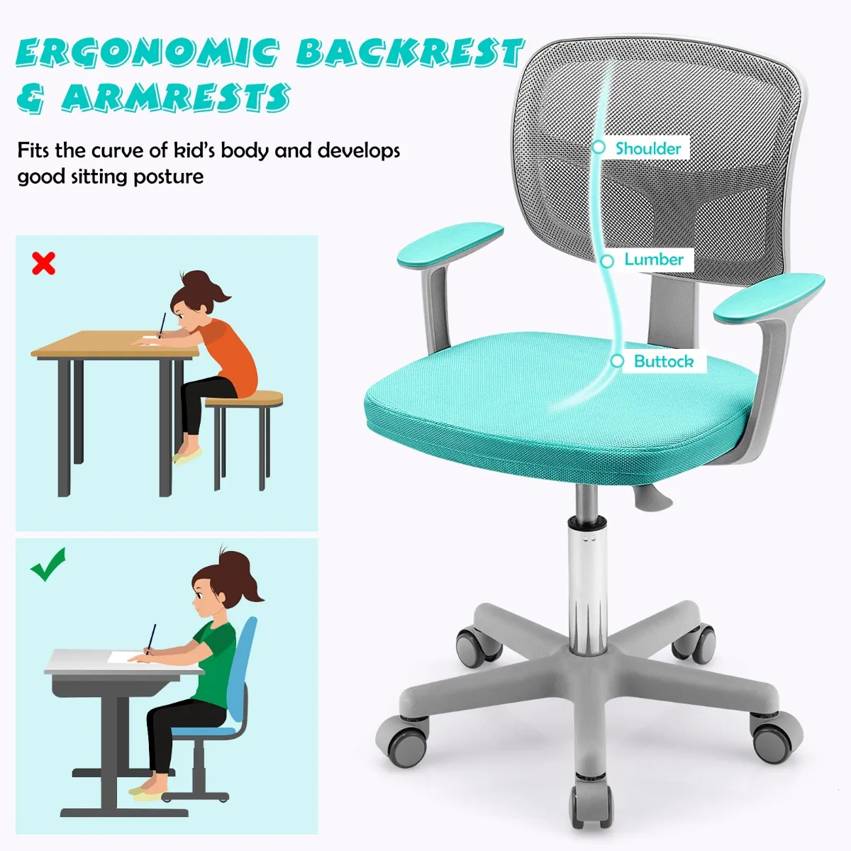 【Ergonomisch ontwerp】: De bureaustoel heeft een rugleuning met lendensteun en een diepe zitting om vermoeidheid door lange uren zitten en studeren te verminderen. De armleuningen geven steun en moedigen kinderen aan om een goede zithouding aan te nemen.