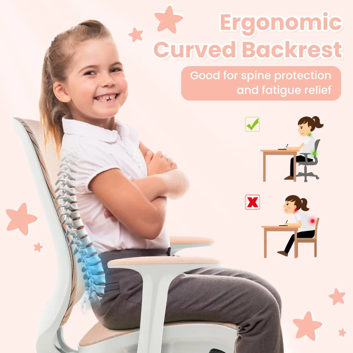 Ergonomische rugleuning en armleuningen: De ergonomisch gebogen rugleuning met rugsteun past goed bij de lichaamscurve van het kind, beschermt de wervelkolom en verlicht vermoeidheid. Bovendien bieden de gladde armleuningen extra ondersteuning aan de armen, zodat ze extra kunnen ontspannen.