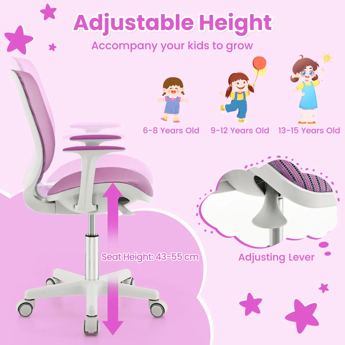 Dankzij het hoogwaardige gasveersysteem en de verstelhendel kan de stoel eenvoudig omhoog en omlaag worden gebracht. De ergonomische rugleuning helpt kinderen een goede zithouding te ontwikkelen. De gladde armleuningen en de elastische mesh-bekleding bieden extra zitcomfort. Het ademende nylon mesh-materiaal zorgt voor warmteafvoer en uitstekende duurzaamheid. Bovendien maakt de 360° draaibare stoel het gemakkelijk om van richting te veranderen. 5 flexibele wielen zorgen voor gemakkelijke verplaatsing. En de zit-rem-zwenkwielen vergrendelen automatisch wanneer de druk meer dan 25 kg bedraagt en worden automatisch losgemaakt wanneer de kinderen opstaan.