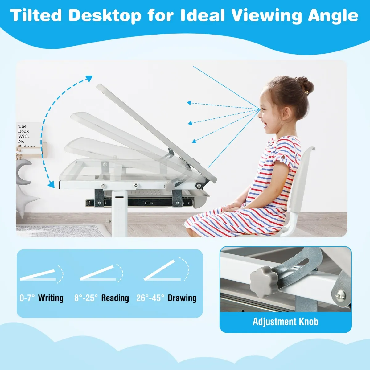Het bureaublad kan in een hoek van 0-45° worden gezet om te lezen, schrijven, tekenen, enz.