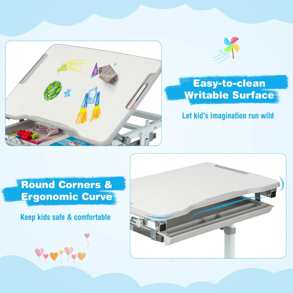 【Gemakkelijk op te zetten en schoon te maken】Het bureaublad is bekleed met een beschermende coating en is krasbestendig en beschrijfbaar, zodat kinderen tijdens het studeren op het bureau kunnen schrijven. Het is gemakkelijk schoon te maken met een vochtige doek, wat u veel moeite en tijd bespaart. Alle onderdelen worden meegeleverd voor een eenvoudige montage, en je bent binnen een paar minuten klaar.
