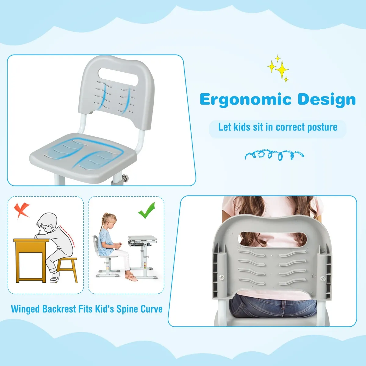 Perfect voor kinderen van verschillende leeftijden (4 jaar +), zowel bureau als stoel kunnen handig worden aangepast voor een meer comfortabele zitpositie voor kinderen. De tafel en stoel zijn gemaakt van hoogwaardig MDF-materiaal en massieve ijzeren poten, en hebben een stevige constructie voor langdurig duurzaam gebruik. De stoel kan tot 100 kg dragen, terwijl het tafelblad een gewichtscapaciteit van 60 kg heeft. U hoeft zich dus geen zorgen te maken over de betrouwbaarheid. Bovendien is de set uitgerust met een gekanteld bureaublad om te lezen, schrijven en tekenen, en biedt het de juiste afstand om het zicht en de ruggengraat te beschermen.