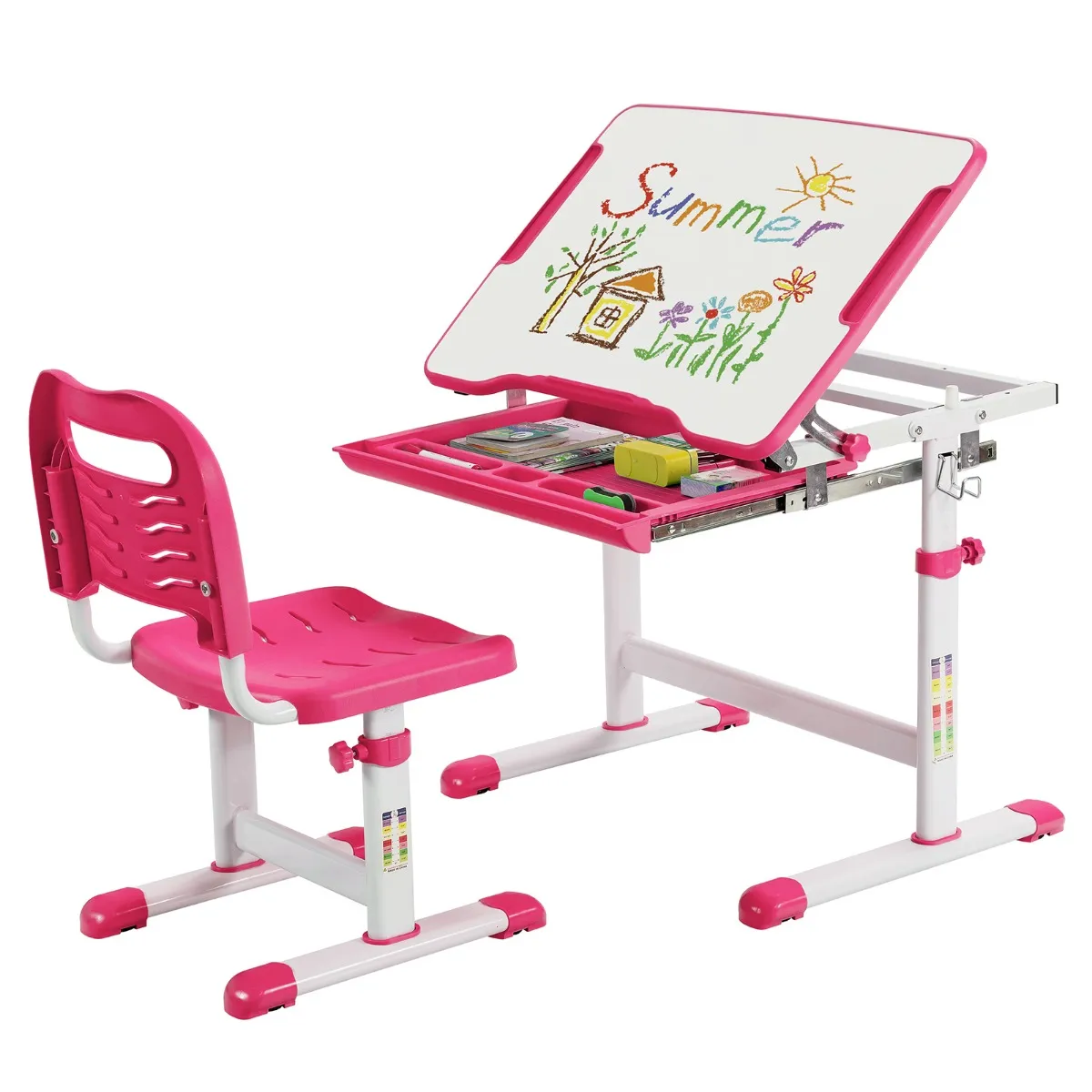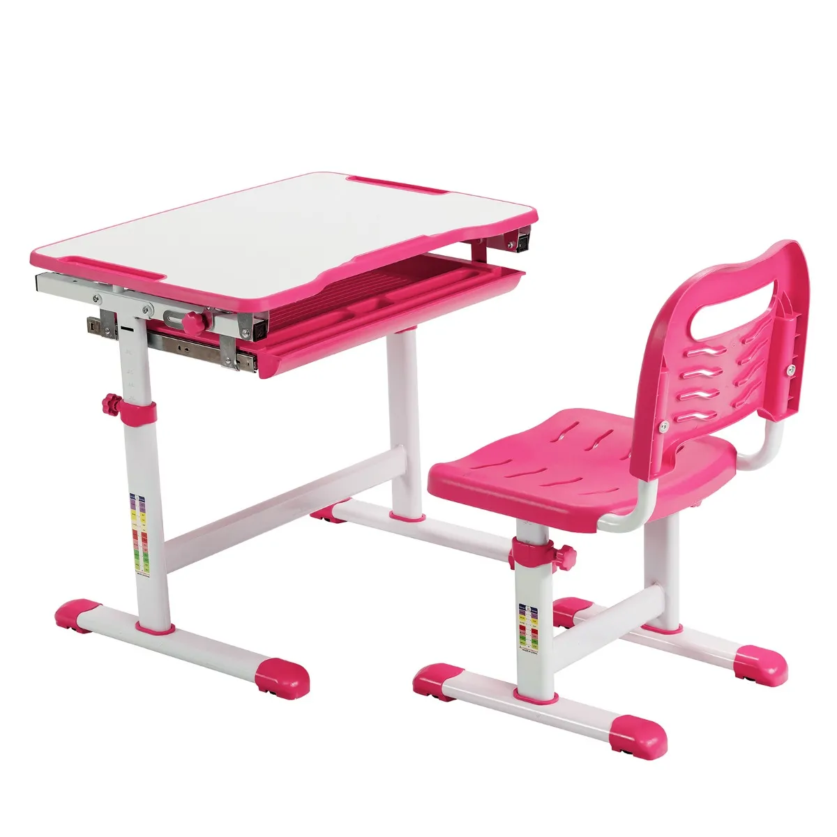 Perfect voor kinderen van verschillende leeftijden (4 jaar +), zowel bureau als stoel kunnen handig worden aangepast voor een meer comfortabele zitpositie voor kinderen. De tafel en stoel zijn gemaakt van hoogwaardig MDF-materiaal en massieve ijzeren poten, en hebben een stevige constructie voor langdurig duurzaam gebruik. De stoel kan tot 100 kg dragen, terwijl het tafelblad een gewichtscapaciteit van 60 kg heeft. U hoeft zich dus geen zorgen te maken over de betrouwbaarheid. Bovendien is de set uitgerust met een gekanteld bureaublad om te lezen, schrijven en tekenen, en biedt het de juiste afstand om het zicht en de ruggengraat te beschermen.