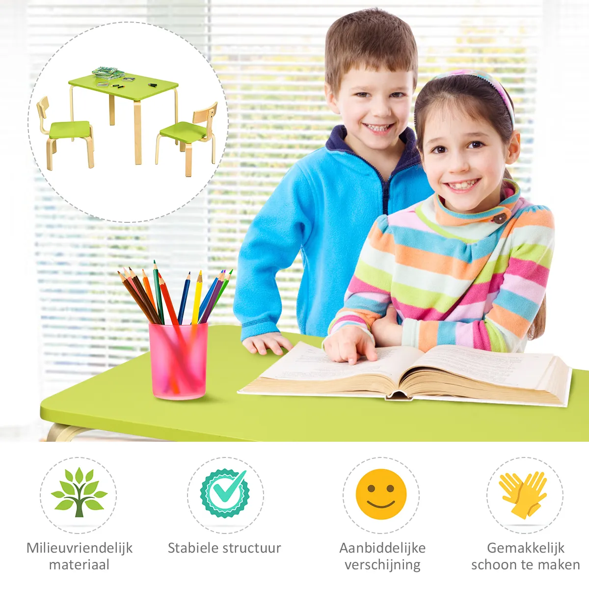 Dit is onze 3-delige tafel en stoelset, die een perfect centrum is voor kinderen om te genieten van eten, lezen, creëren en spelen.