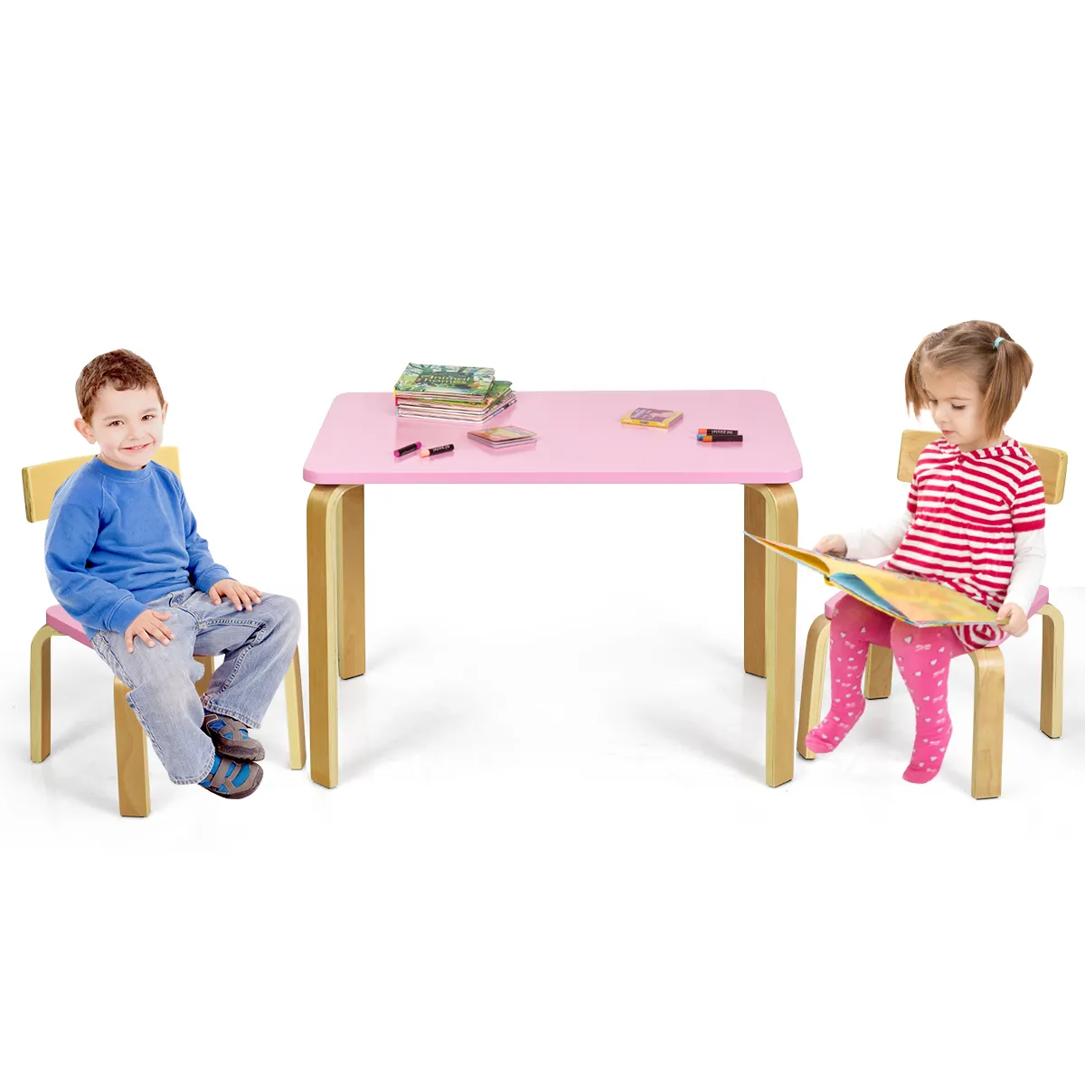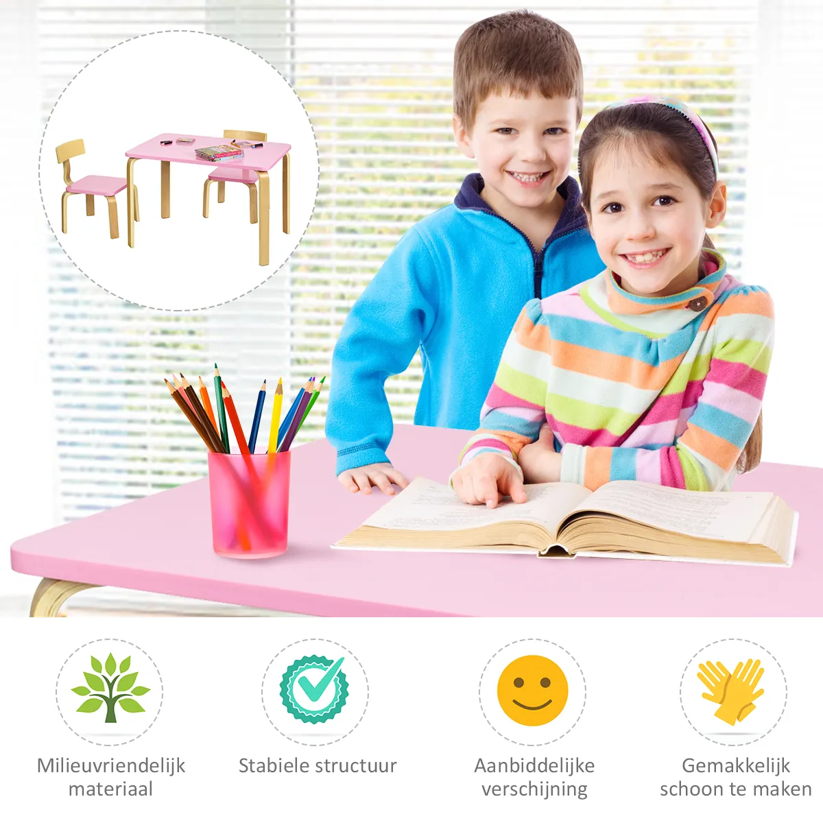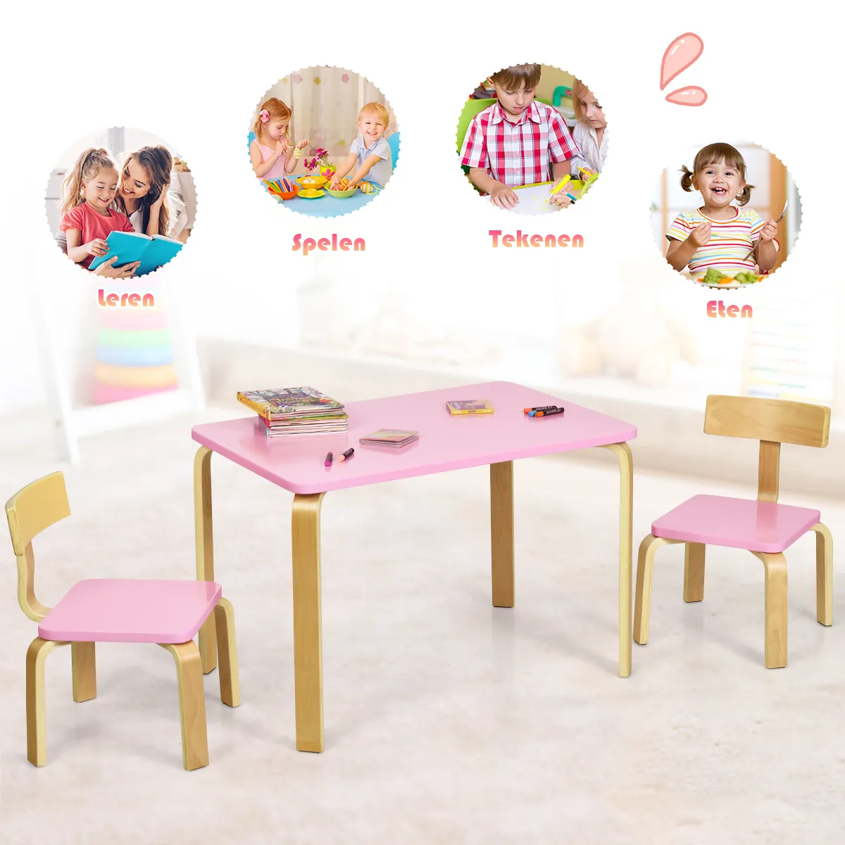 Dit is onze 3-delige tafel en stoelset, die een perfect centrum is voor kinderen om te genieten van eten, lezen, creëren en spelen.