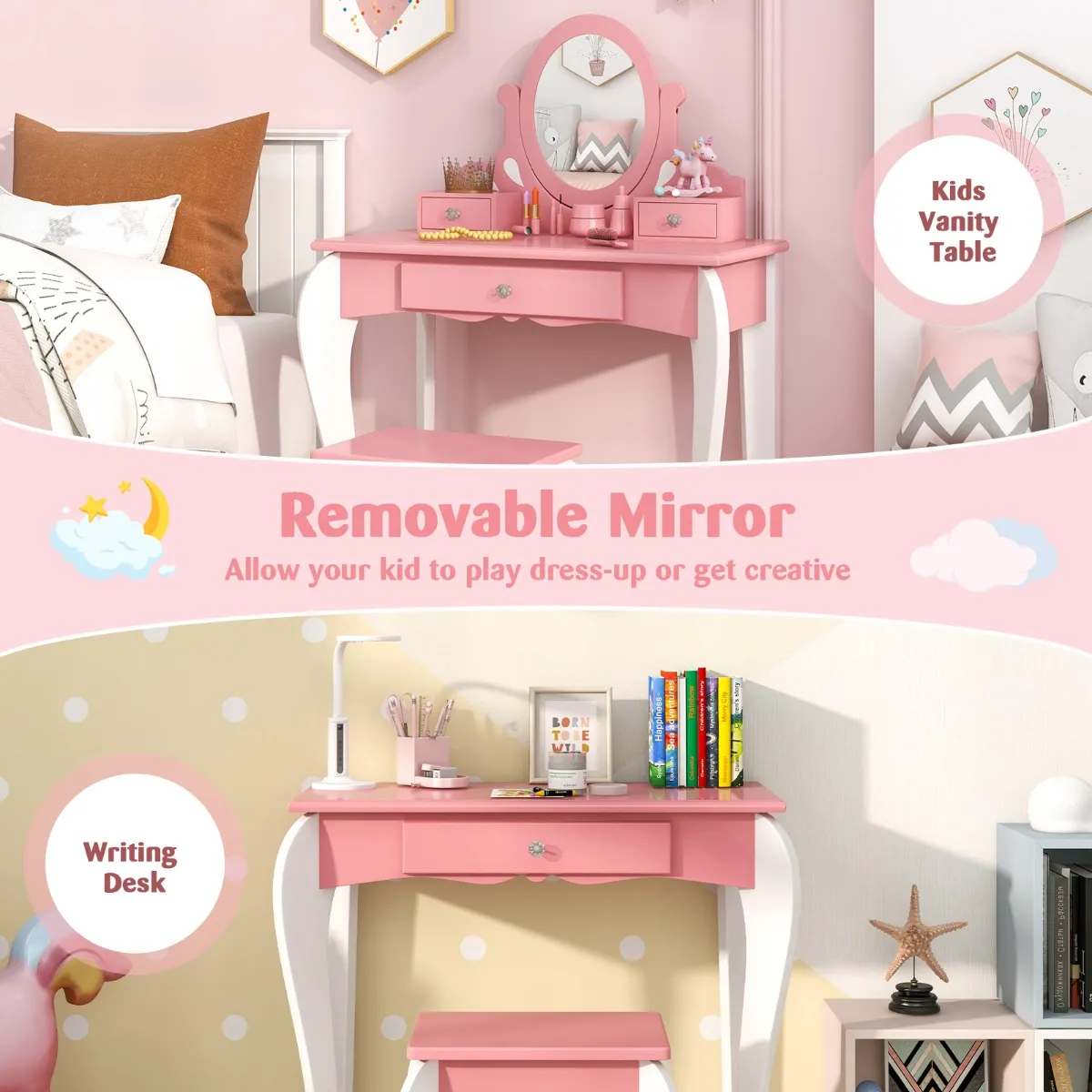 【Tweeledig gebruik met afneembare bovenkant】Het bovenste deel van deze make-up tafel kan worden weggeschoven, zodat uw kind deze tafel kan gebruiken als een bureau om boeken te lezen, tekeningen te maken, snacks te eten of spelletjes te spelen. Bovendien geeft het bijpassende krukje uw kind een stabiele plek om te zitten en kan het onder de tafel worden weggestopt wanneer het niet wordt gebruikt om ruimte te besparen.