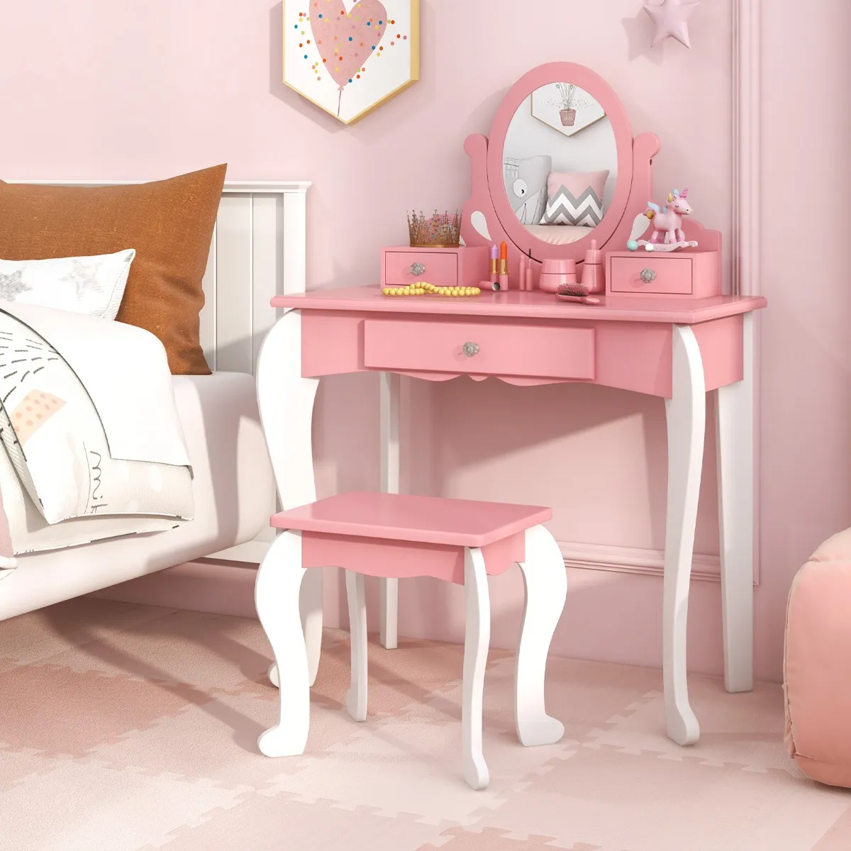 Uitgerust met een grote spiegel die 360 graden kan draaien, stelt deze kaptafel uw kind in staat om de hoek aan te passen om een perfecte reflectie voor make-up te bereiken. En de spiegel kan worden verwijderd om meerdere doeleinden te bereiken. Het bijpassende krukje biedt uw kind een stabiele en comfortabele plek om te zitten wanneer het haar doet of zich aankleedt. Bovendien heeft de kaptafel 3 schuiflades, zodat er voldoende ruimte is om de make-up, sieraden of andere benodigdheden van uw kinderen op te bergen. Gemaakt van hoge kwaliteit MDF, deze kaptafel set zorgt voor een lange levensduur. Zowel de tafel als de kruk zijn ontworpen met afgeronde hoeken en gebogen poten voor veiligheid en stabiliteit. Ondertussen kunnen de anti-slip voetzolen uw vloer beschermen tegen krassen en de anti-kantelbeveiliging is ontworpen voor extra veiligheid. Deze schattige kinderset zal een aantrekkelijk decor in uw huis zijn.