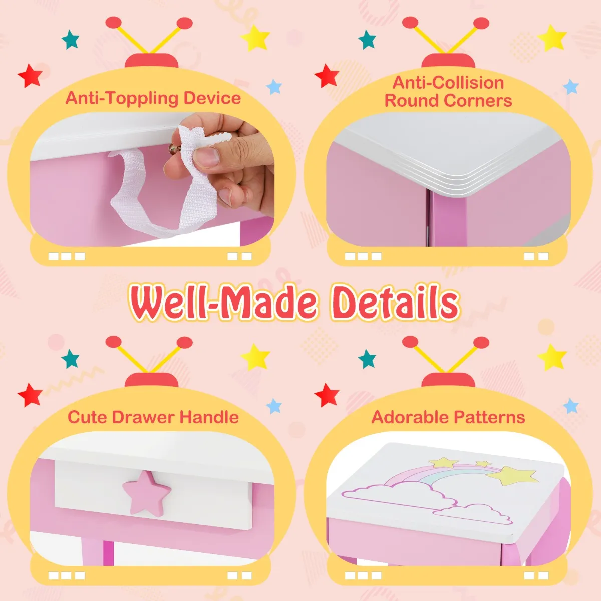 Met de duidelijke spiegel, helpt deze set van de kinderen kaptafel en krukje met leuke patronen uw meisje om prinsessen droom te bereiken zodat kan zij omhoog maken en zich hier aankleden. En u kunt de bovenkant verwijderen als uw kinderen zich moeten concentreren op tekenen of schrijven. Na het opmaken of studeren is er een praktische lade met voldoende ruimte om de spullen van uw kleine meid in op te bergen, zodat het tafelblad netjes en schoon blijft. Met het oog op de veiligheid van uw kinderen, is deze hoge kwaliteit ijdelheid set uitgerust met ronde rand ontwerp en anti-kantel apparaat. Om dit perfecte cadeau snel aan uw kleine prinses te geven, zal de instructie u helpen om het in elkaar te zetten. En het gladde oppervlak kan worden gereinigd met een vochtige doek voor groot gemak.