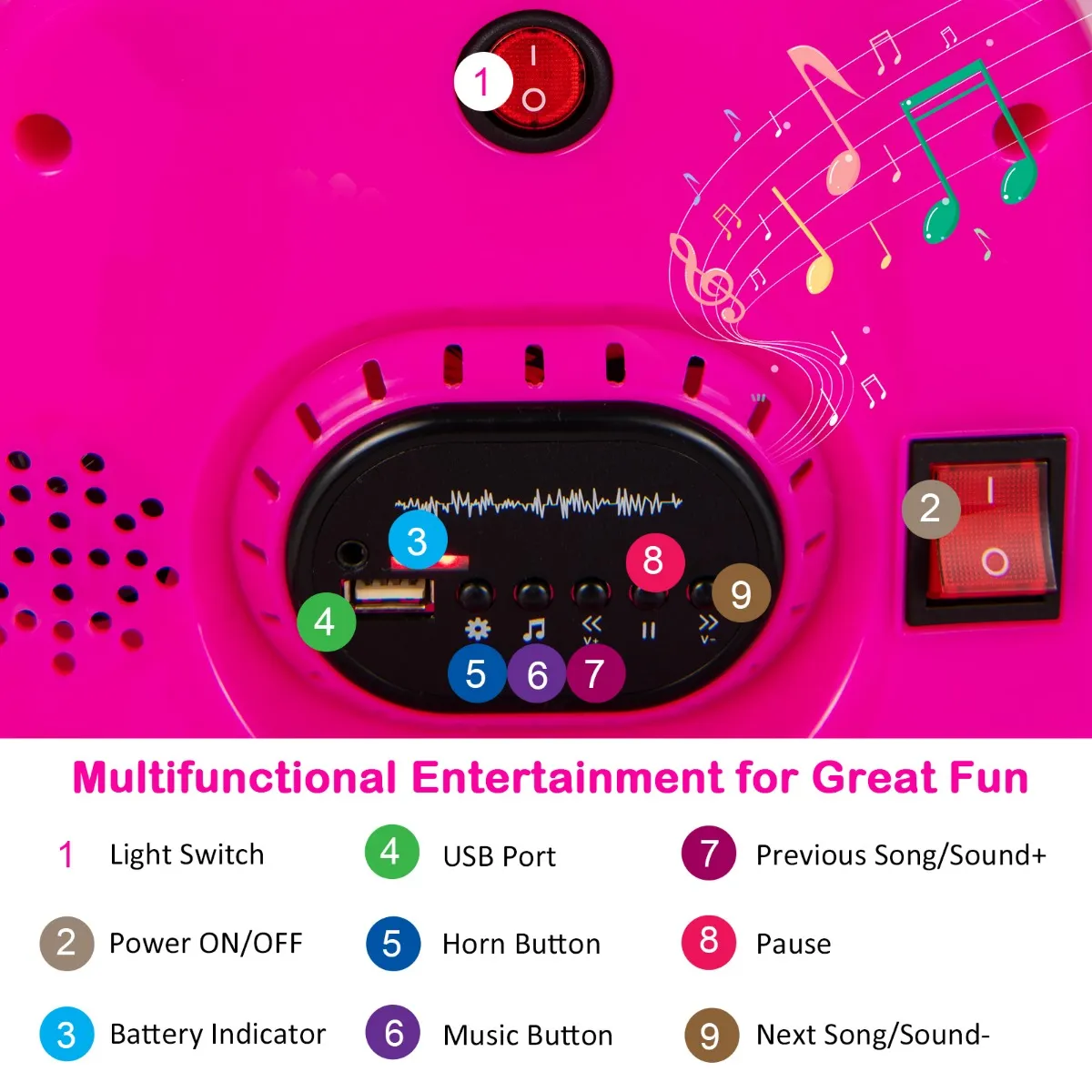 【Interessante muziek & Lichte effecten】Light-up LED randen en kleurrijke koplampen maken het aantrekkelijker. Hoorn, ingebouwde muziek en verhaal brengen meer plezier tijdens het rijden van het kind. Bovendien kunt u via de USB-poort van het bedieningspaneel andere externe apparaten aansluiten voor meer muziekopties.