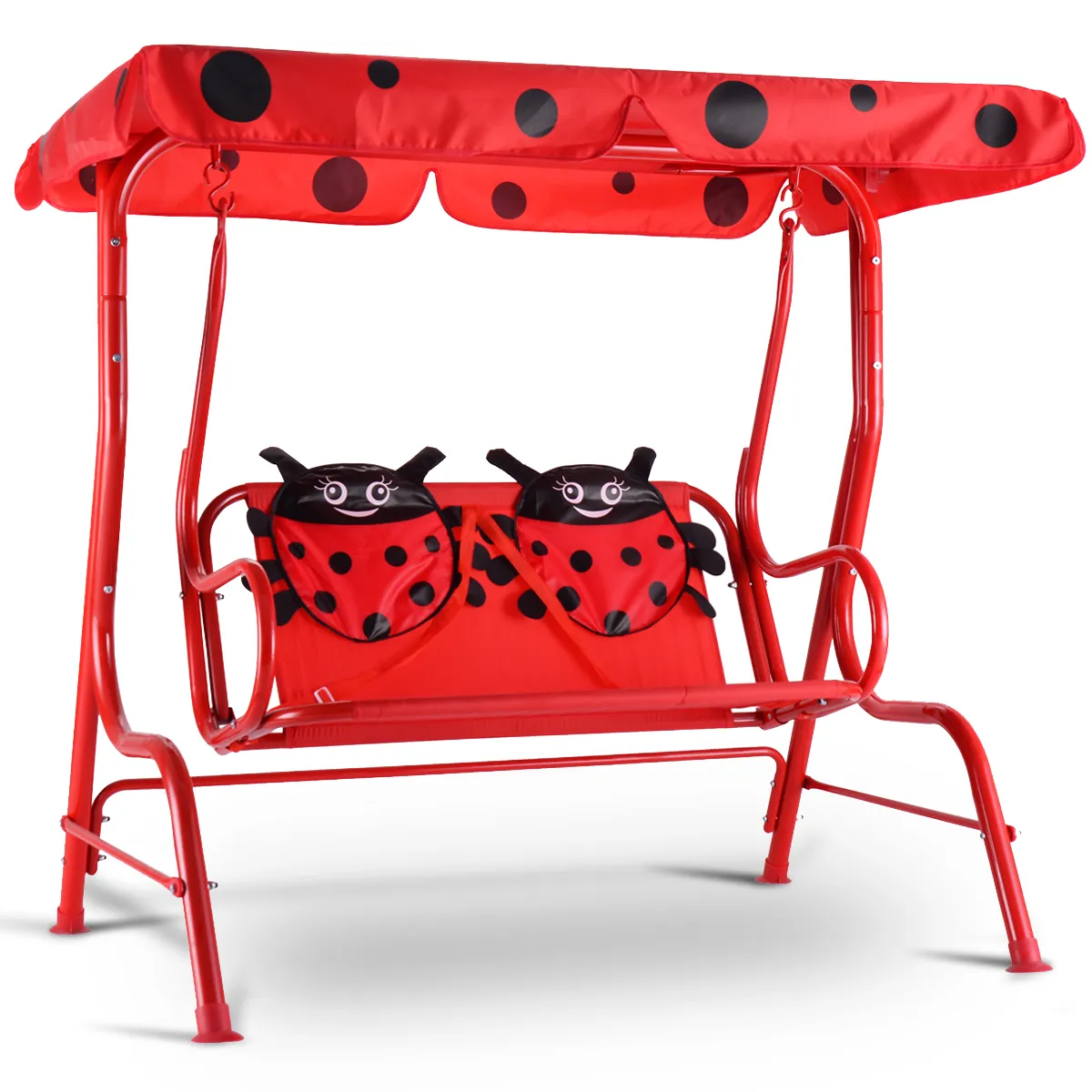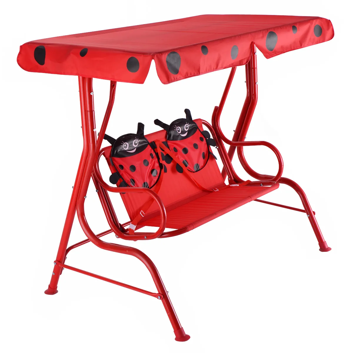 Deze kinderen patio schommel is een perfect cadeau voor uw baby. De metalen constructie maakt deze schommel stabieler en duurzamer. De afneembare en verstelbare luifel biedt bescherming aan uw kinderen wanneer ze buiten spelen. Elke stoel heeft een veiligheidsgordel om de veiligheid van kinderen te garanderen. De hele schommel is glad gelast zonder scherpe randen om de veiligheid te garanderen. De antislipvoetjes houden de schommel niet alleen stabiel, maar beschermen ook uw vloer tegen krassen. Aarzel niet om er een te kopen!