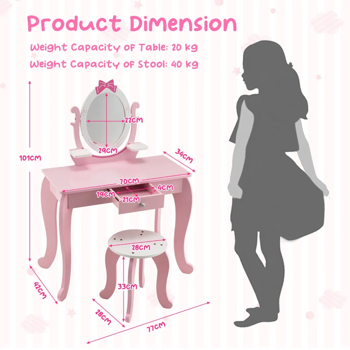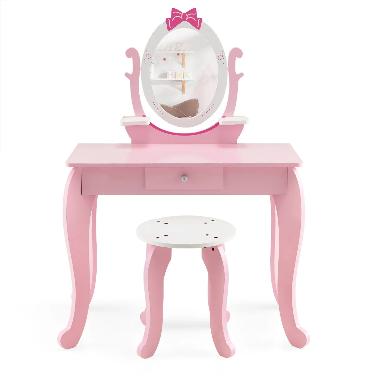 Elk klein meisje droomt ervan een prinses te zijn. En hier is onze 2-in-1 kaptafel en kruk set voor kinderen. Deze kaptafel en kruk voor kinderen is gemaakt van hoogwaardig MDF en is duurzaam en stevig. Het grote tafelblad en de handige lade bieden voldoende opbergruimte voor de dagelijkse benodigdheden van de kinderen. En het afneembare blad kan gebruikt worden als schrijftafel. Bovendien is er rekening gehouden met veel doordachte details, zoals afgeronde hoeken, een mooie ladeknop en een verstevigd frame. Het schattige uiterlijk zal de aandacht van de meisjes trekken. Voor het dagelijkse onderhoud is het waterbestendige oppervlak een grote hulp.