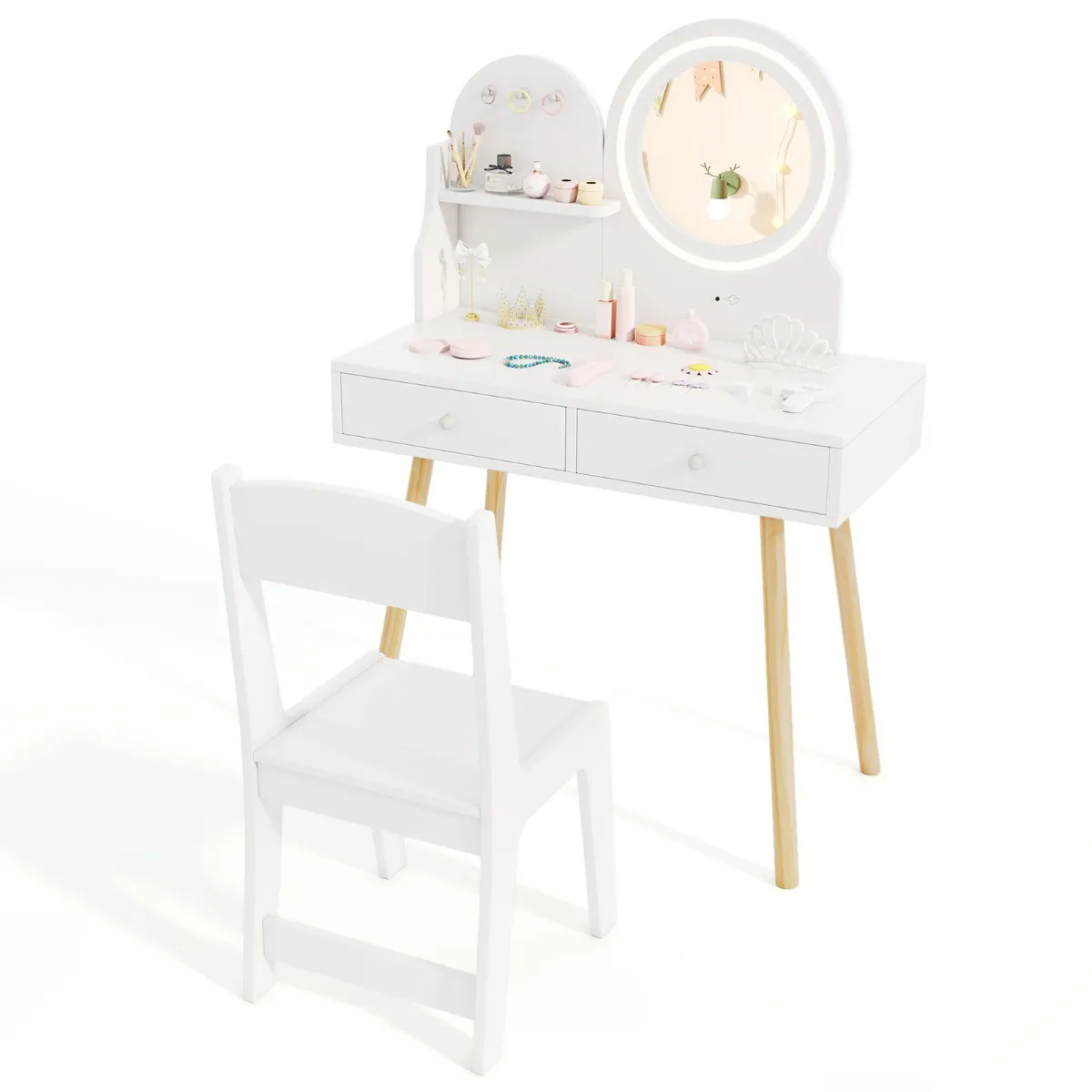 【Make-upspiegel met LED-licht】: Deze kaptafel voor kinderen is ontworpen met een spiegel en lampjes om de fantasierijke speelstijl van uw kind te verlichten, met 2 kleurstanden – wit en geel. Let op: Vereist 3 AA-batterijen (niet inbegrepen).